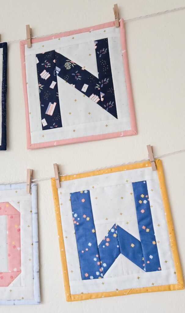I used the Riley Blake Design’s Basic Sparkler Vintage White Sparkle for the background (it matches perfectly!) and I feel the specks of gold adds to the whimsy of the banner. For each letter I used one print to spell out the letter and contrasting print for the binding.