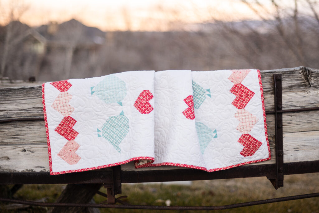 The Heart to Heart Runner Boxed Kit includes pattern and fabric for runner top and binding. Backing not included. Fabric featured is You & Me by Sandy Gervais. Pattern is also by Sandy Gervais of Pieces from My Heart. Finished size is 18″ x 54 1/2″. If you have this item in your shop please email us at blog@rileyblakedesigns.com to be added to this list!