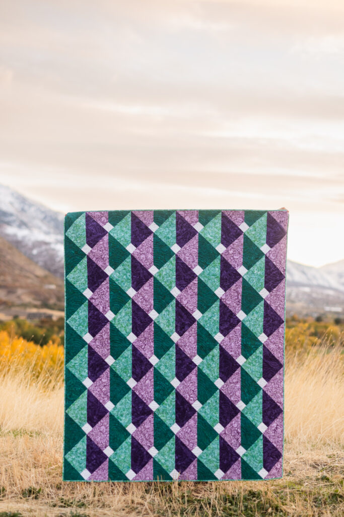 The Cat’s Eyes Quilt by Bound to be Quilting is one of the many ways you can showcase Divine Vines batiks! This quilt features shining centers of square-in-a-square blocks that appear as eyes in the night, and the alternate spinning blocks give the quilt some movement. Finished size is 72″ x 84″ and skill level is confident beginner. Visit their shop to get the pattern!
