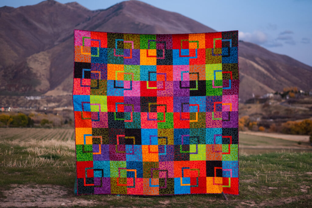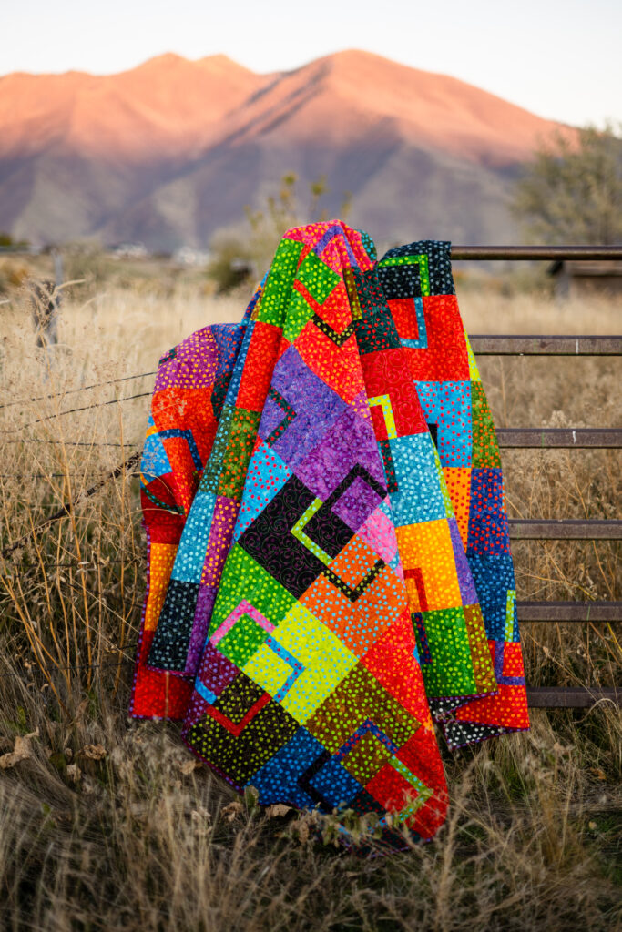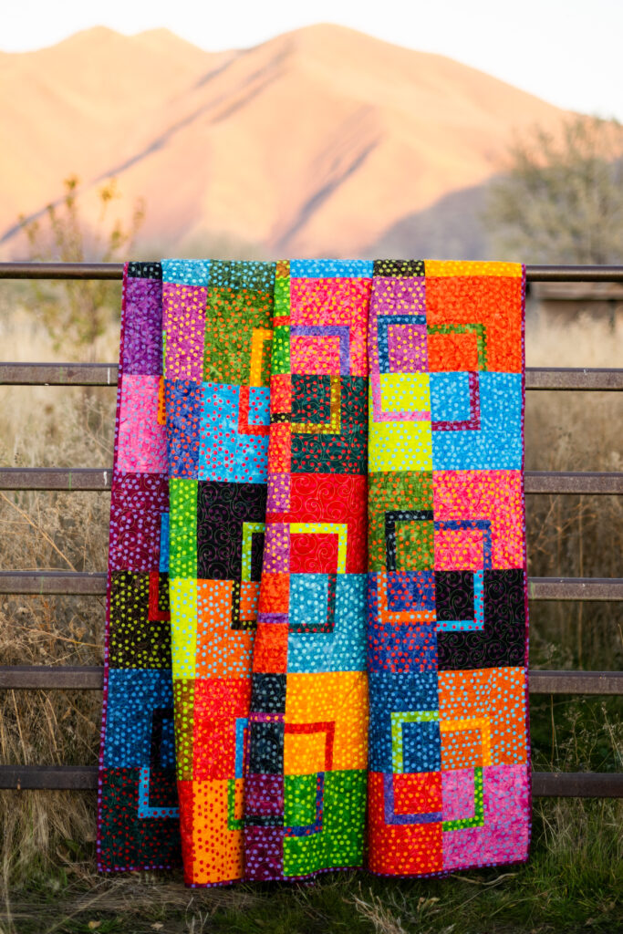 The Written in the Stars Quilt by Charisma Horton is a block based sampler quilt with an array of colors. Finished size is 85″ x 85″. This intricate and colorful quilt pattern is available for purchase on designer Charisma’s website, along with the fabric requirements. And you can visit your favorite local or online quilt shops to get your Polka Pop Elementals batiks!