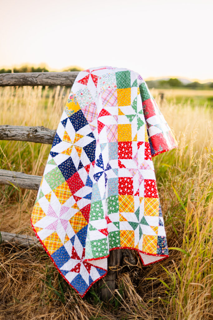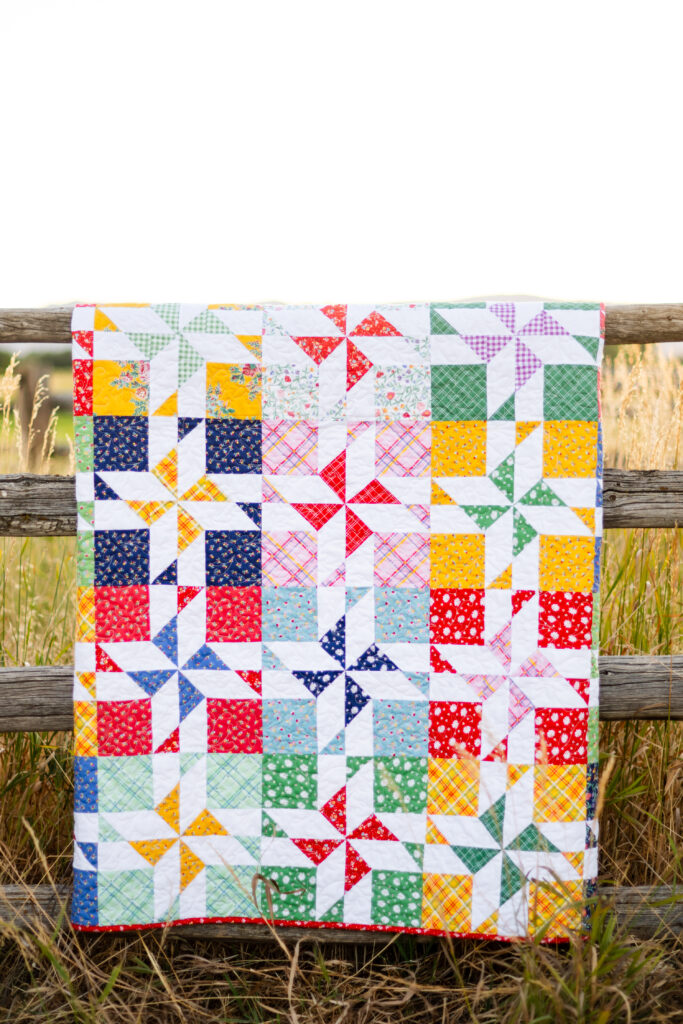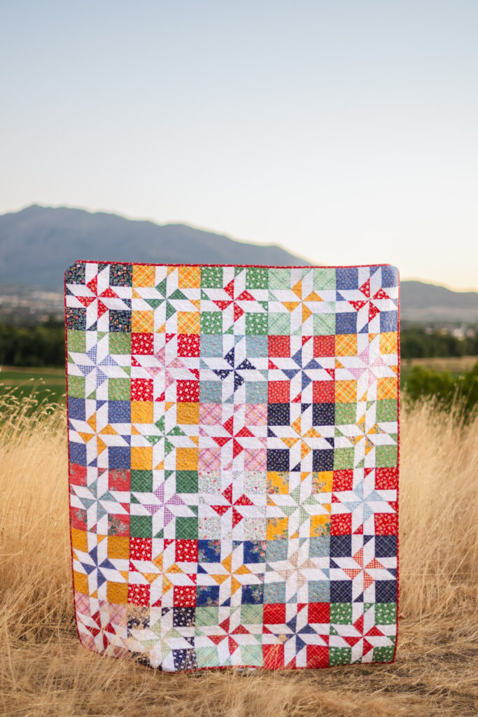 The Skip a Beat Quilt by Sandy Klop of American Jane Patterns is rolie polie and 10″ stacker friendly and features pinwheel blocks! Finished size is 60″ x 72″. The quilt kit includes the Skip a Beat Quilt Pattern and Simple Pleasures fabrics to complete the quilt top and binding, all packaged in a beautiful keepsake box. This kit is available from all of the retailers listed below!