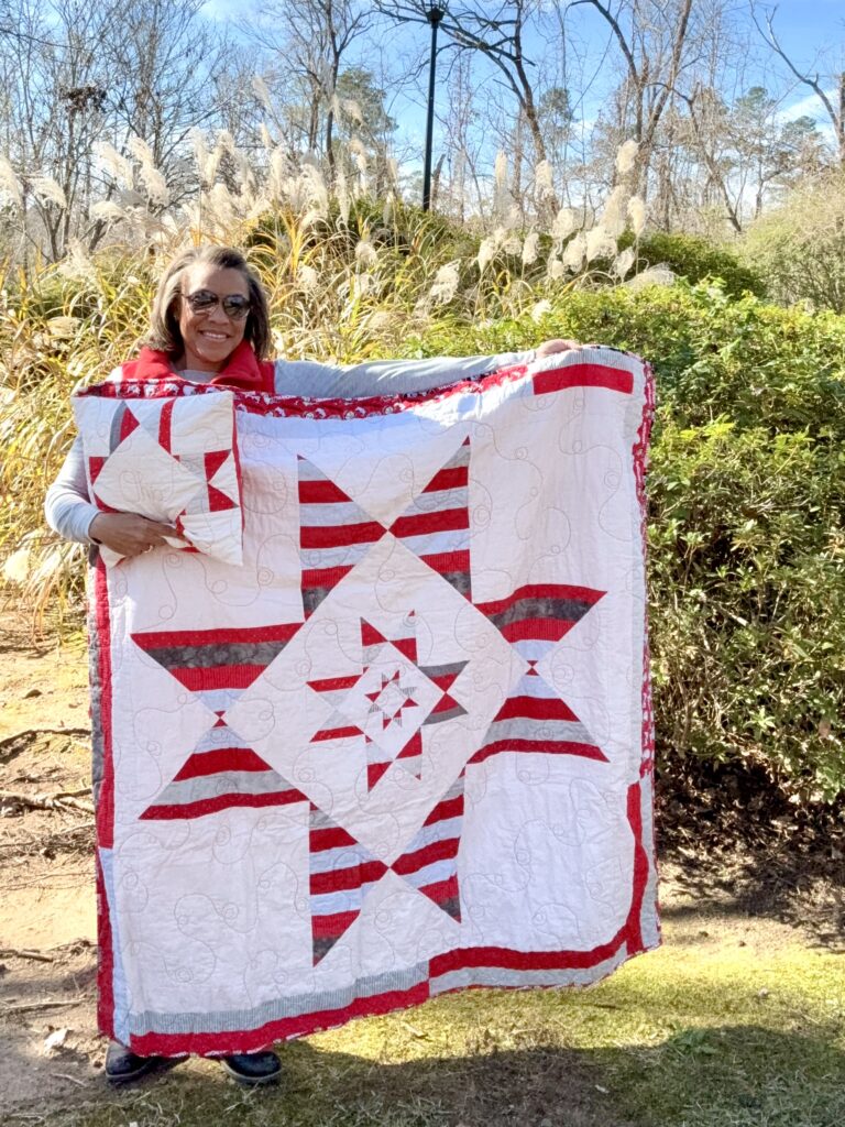 Technically, you don’t need a rolie polie for this quilt. Because I’m a Buckeye, I HAD to do another version in scarlet and gray (if you know, you know!). She will definitely be our new cuddle buddy during football season!