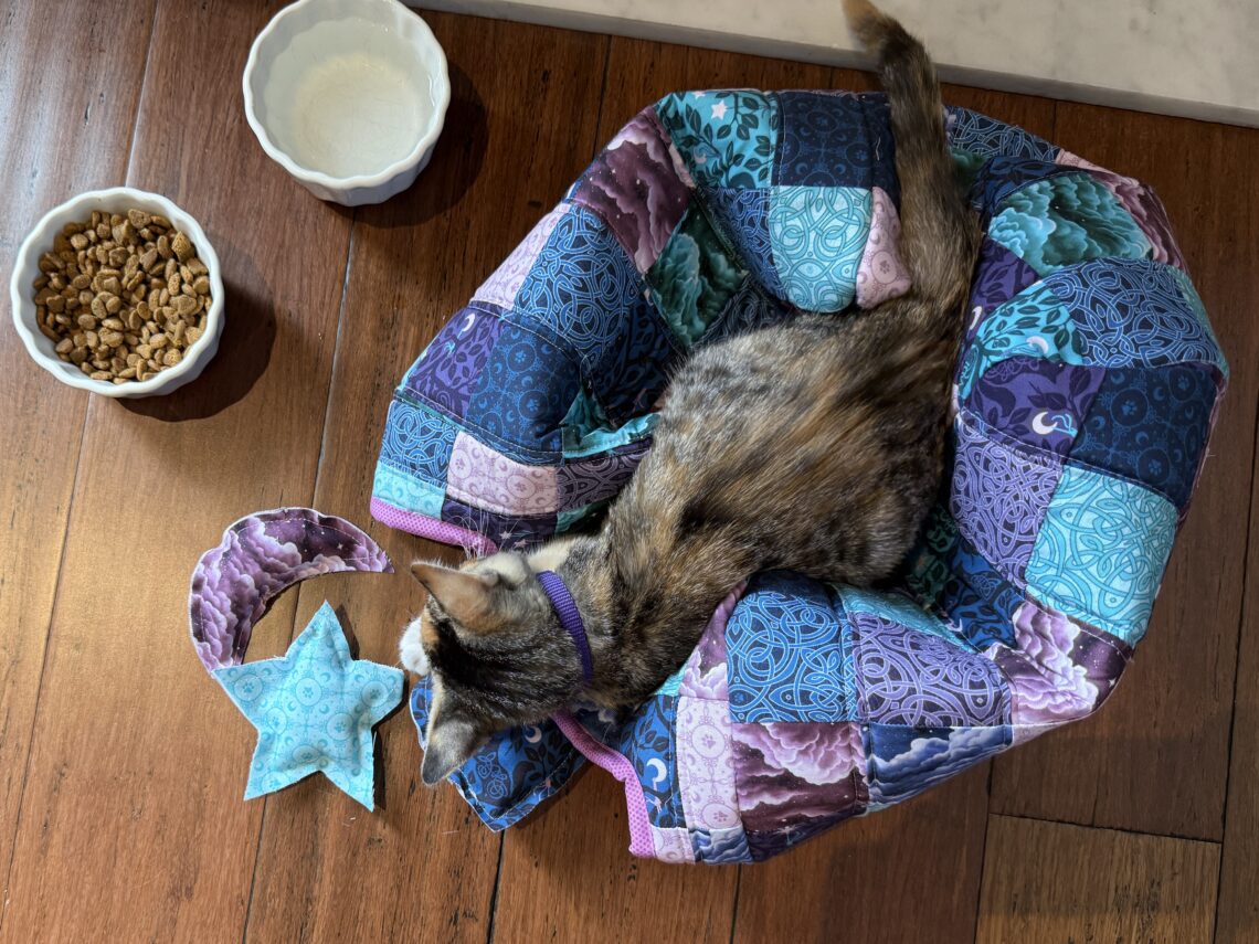 I received this fabric in the mail right around the time we brought Miri home and it felt like the purrrrfect opportunity to make something new for her! This collection is full of bold colors and fun shapes, so I decided to patchwork together a giant panel of squares. I ended up cutting triangular pieces from the big quilted panel and improvised a bin using foam stabilizer. I bound the inside with standard binding and fashioned an entry hole at the front for Miri to climb into. The whole kitten home is soft and flexible, perfect for her to jump on and roll around in.