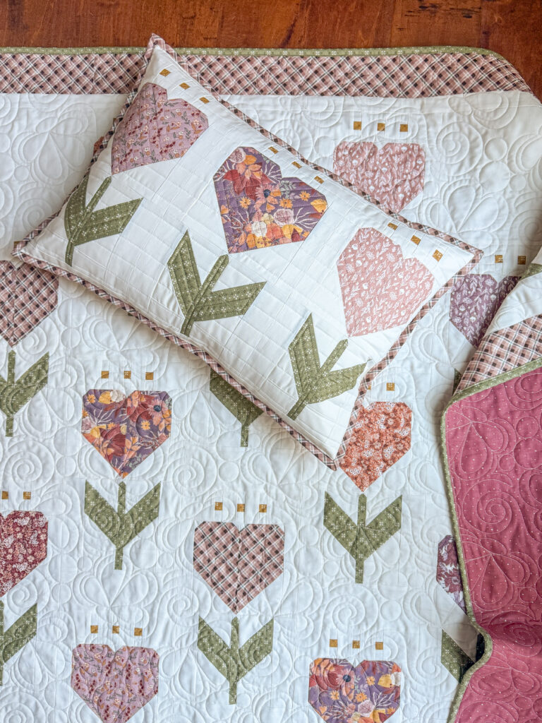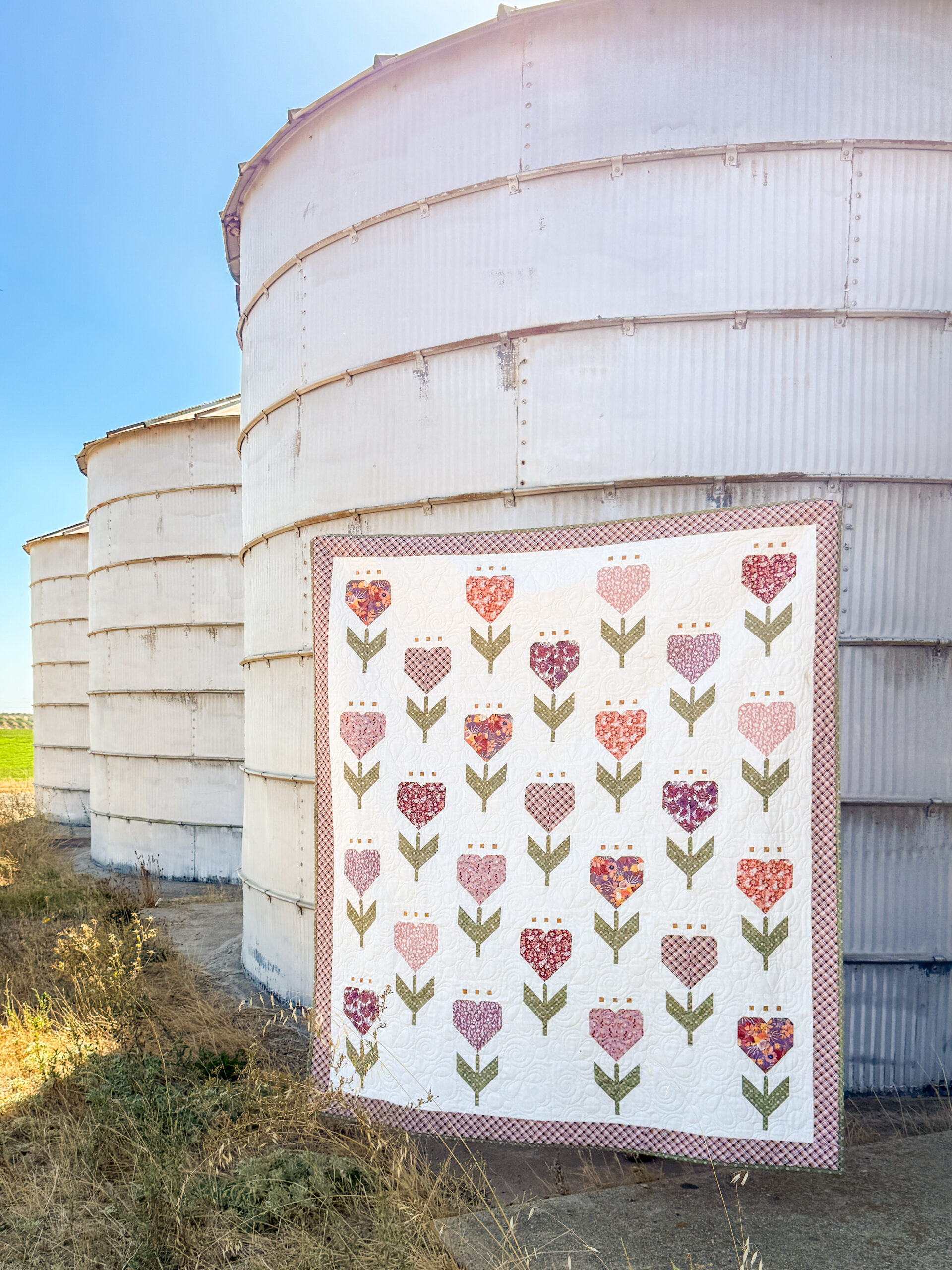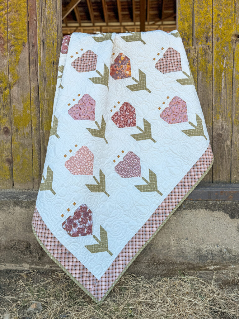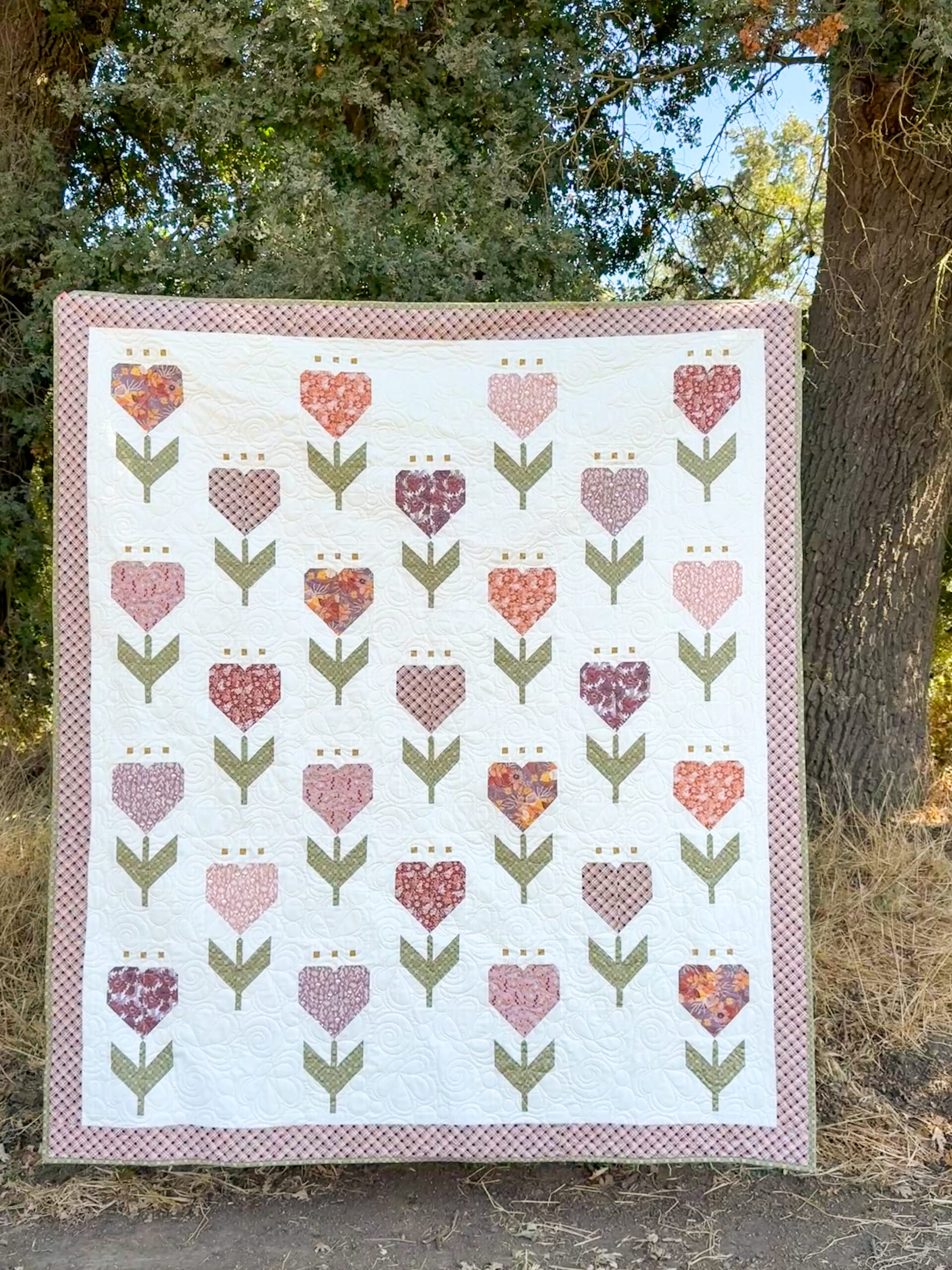 My Grown with Love quilt combines heart-shaped tulip blocks that symbolize love, growth, and all the little moments that make handmade projects so worth the effort. Each block features one of the beautiful mauve, pink, and soft rust prints in the collection, and the soft green in the stems and more modern dots above the flowers make it the kind of quilt that feels at home in a farmhouse as well as a modern space.