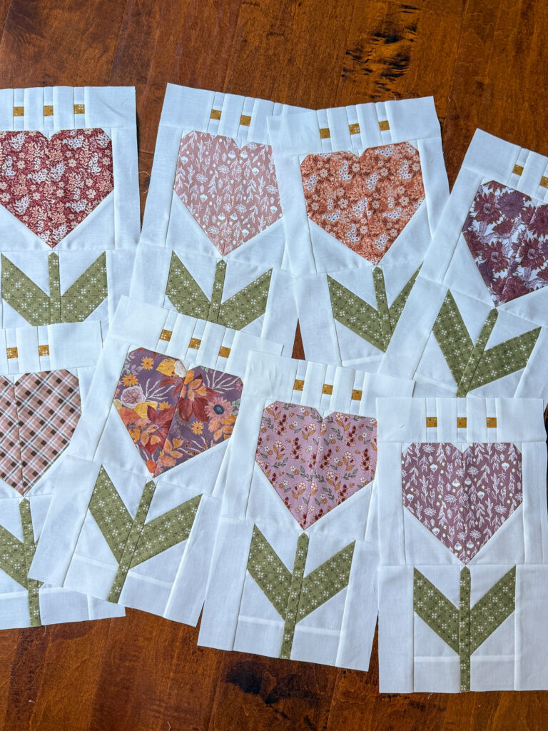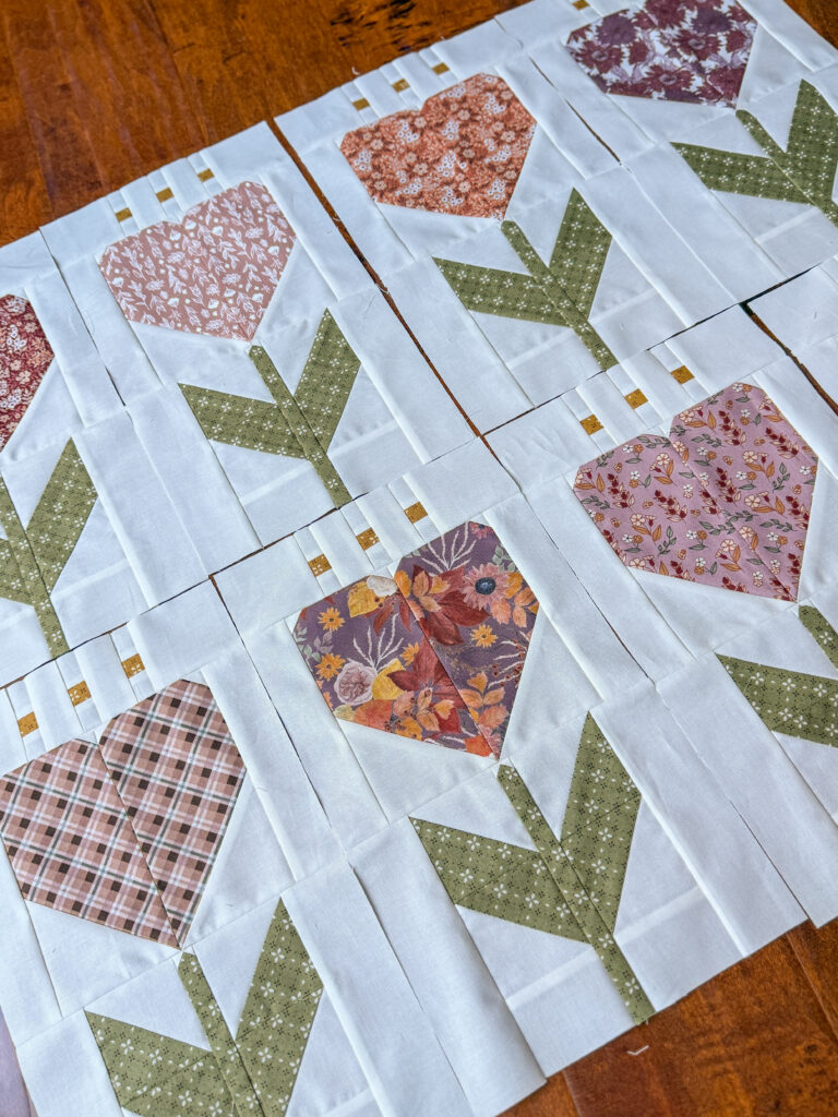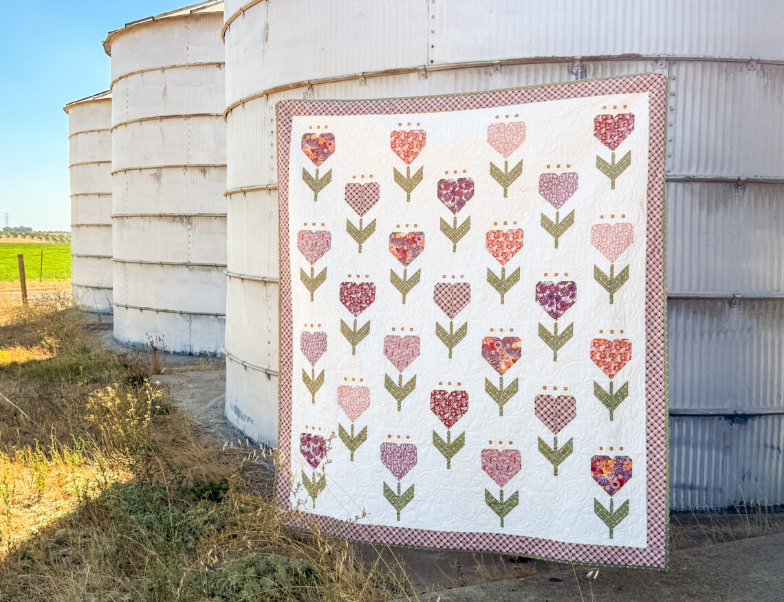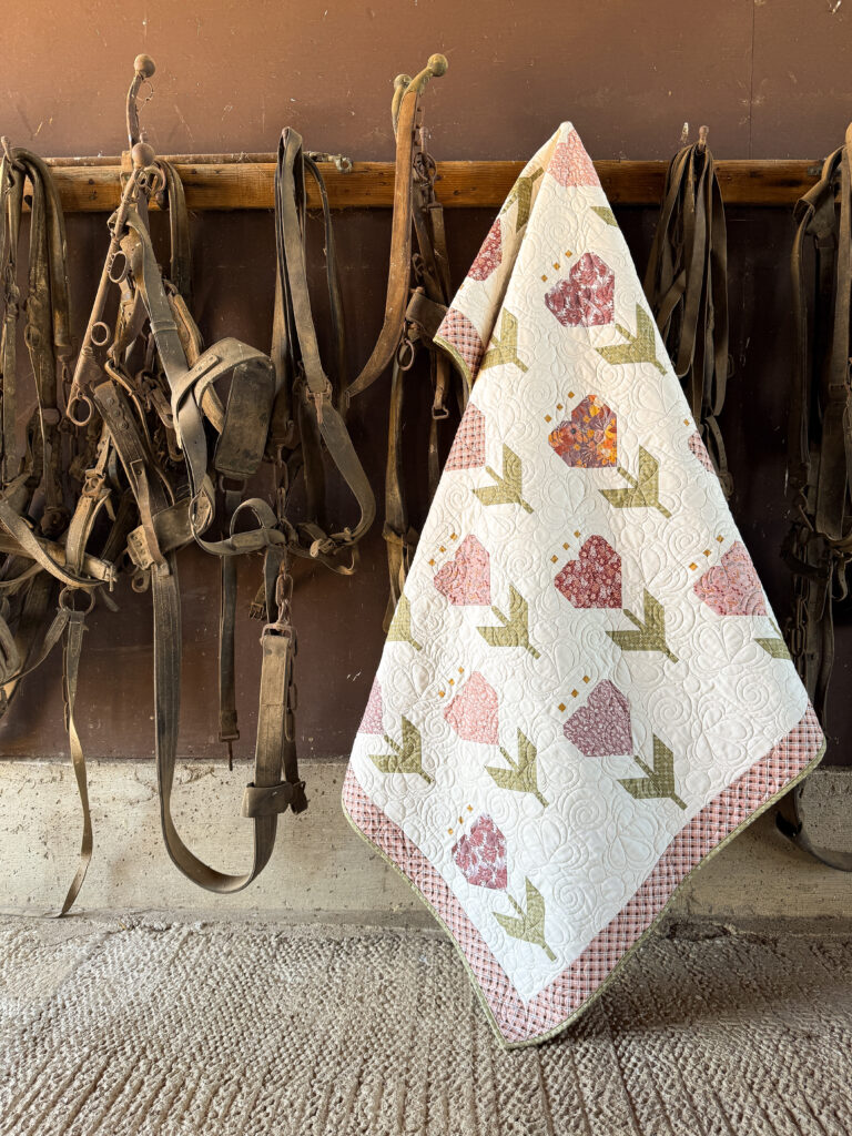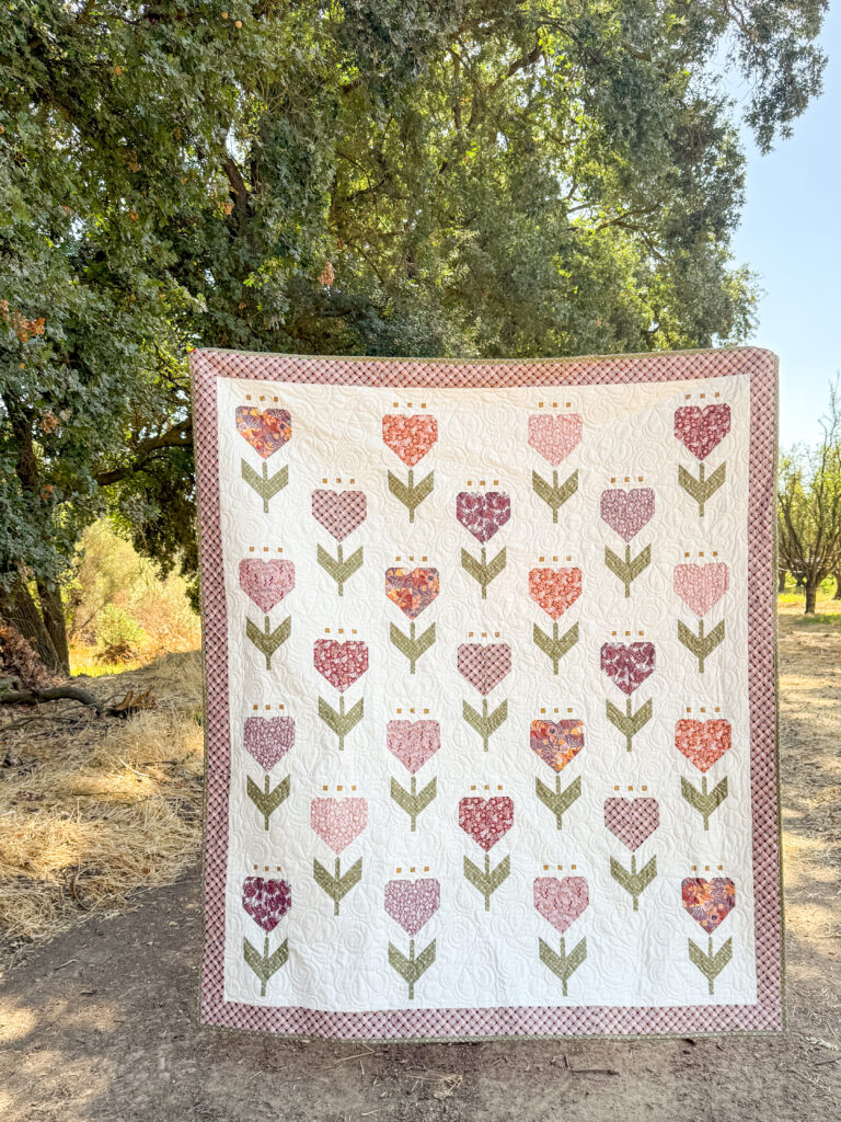 My Grown with Love quilt combines heart-shaped tulip blocks that symbolize love, growth, and all the little moments that make handmade projects so worth the effort. Each block features one of the beautiful mauve, pink, and soft rust prints in the collection, and the soft green in the stems and more modern dots above the flowers make it the kind of quilt that feels at home in a farmhouse as well as a modern space.