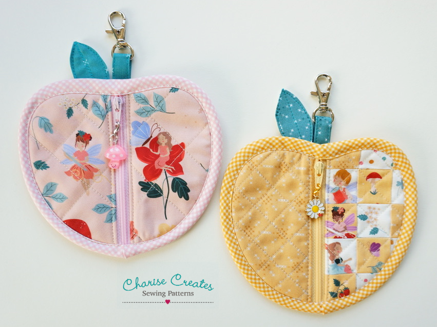 The Petal Purse has a d-ring tab so you can add a bag charm. I made a version of my FREE Apple Zipper Pouch to adorn my Petal Purse.
