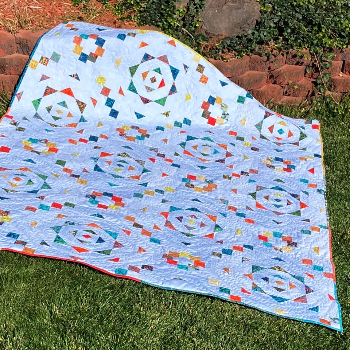 Hello to all of my Riley Blake friends! It’s Melissa Corry here, visiting from Happy Quilting. Today I am am thrilled to share a brand new Batik finish with you all! Expression Batiks have become a favorite of mine to work with. The new collections are just so pretty in all of their beautiful colors and prints. And I just love how happy and bright this new Carnival Glass Collection is. I just released 4 new patterns and I knew right away that I had to remake my Summer Solstice pattern in this collection! It almost gives it a Midnight Solstice look, right!! Such a change up from the original to add so much happy color, and I just love it!