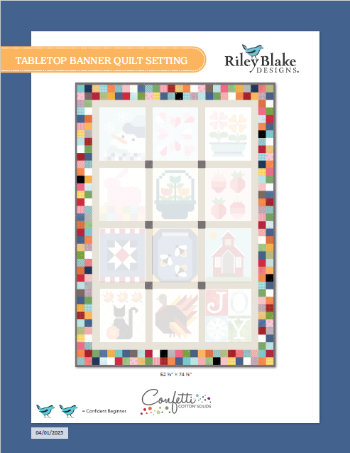 Turn our banner of the month blocks into a stunning quilt with this alternate finish quilt kit! This pattern is intended to be used in conjunction with all twelve of the 2025 Tabletop Banner Patterns, a pattern series featuring twelve different seasonal blocks. Each pattern is a great standalone quilt block, or combine all twelve to create this stunning quilt! Tabletop Banner Kit of the Month Patterns sold separately.