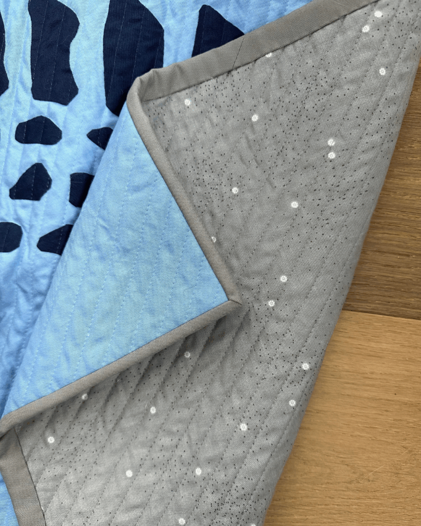 For the backing I used Riley Blake Designs Coordinating Basics, Gray Dainty Daisy. It is both subtle and interesting to look at! The binding was made using the Cement Confetti Cotton solid.
