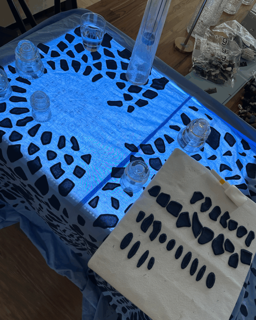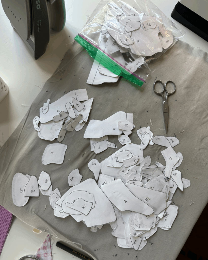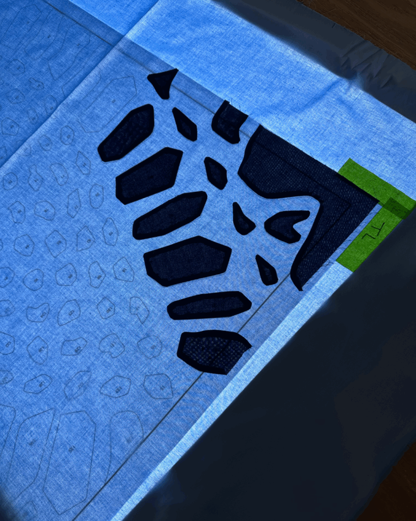 To make the pineapple doily it took 636 appliqué templates! I cut them all out of card stock and prepared each fabric piece on them using my glue, starch, and iron method. After each piece was prepared, I used a light box so that I could see my master pattern under the fabric. I glued the pieces in place, ironed them to set the glue, and then I was ready to hand sew.