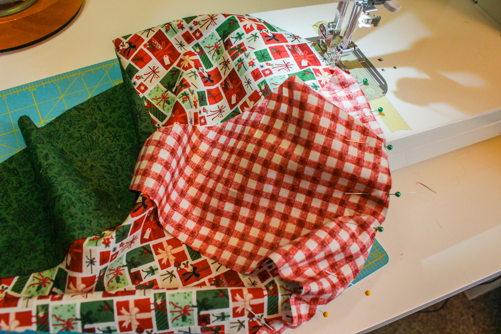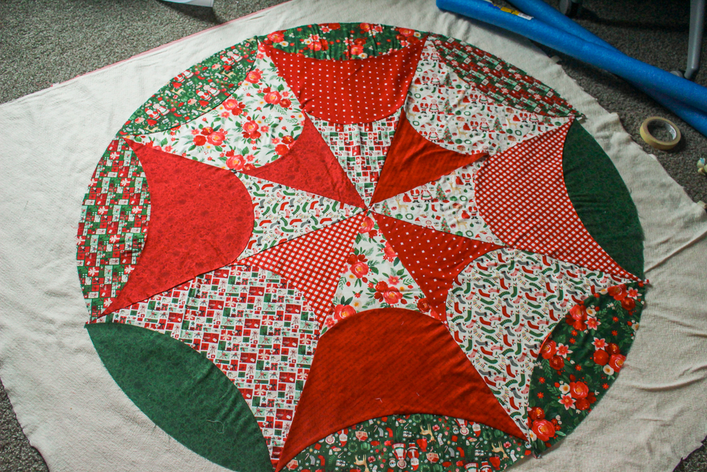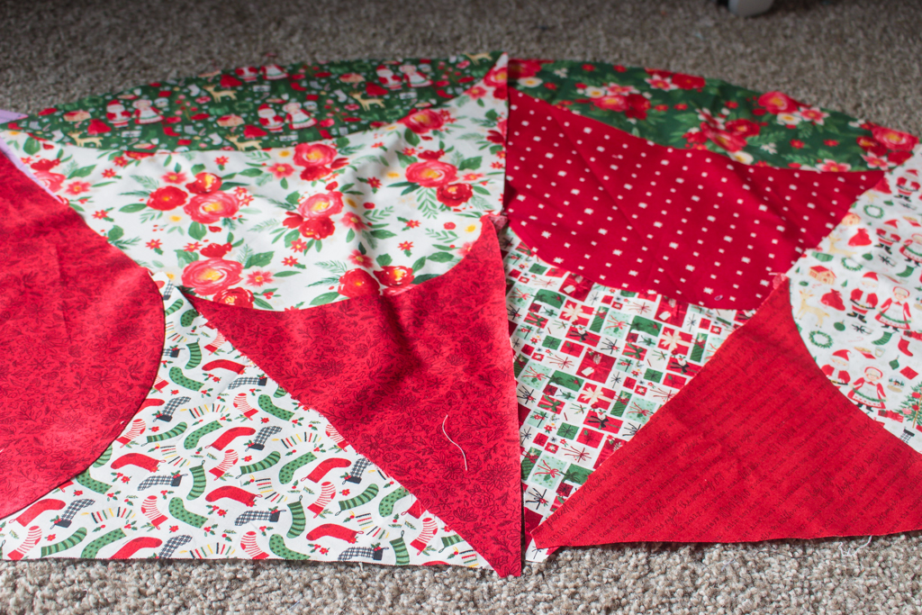 The tree skirt is made by creating 8 ‘slices’ and then sewing the ‘slices’ together, leaving one opening for the slit of the tree skirt.