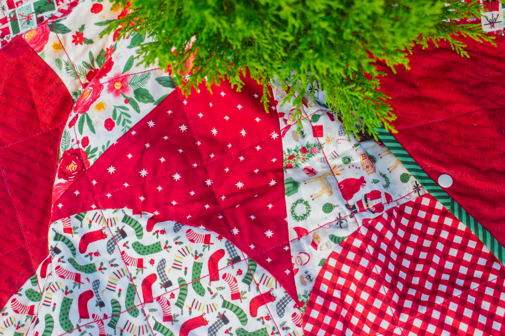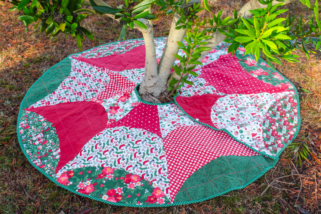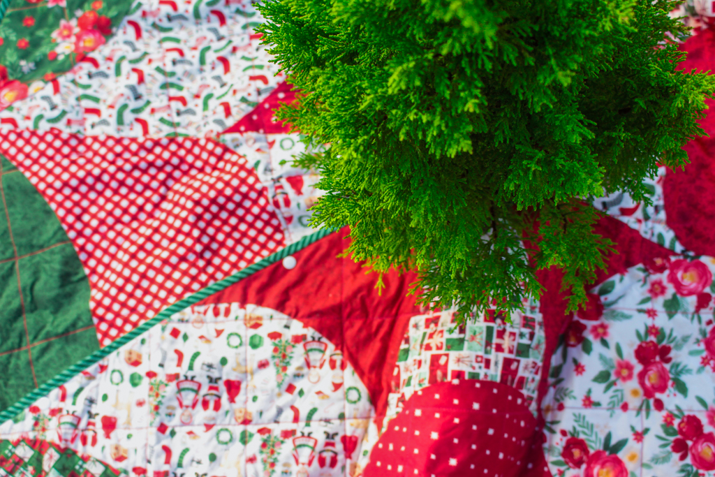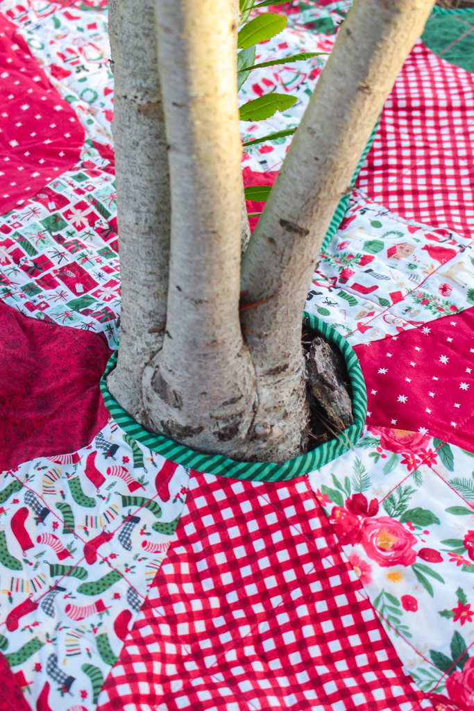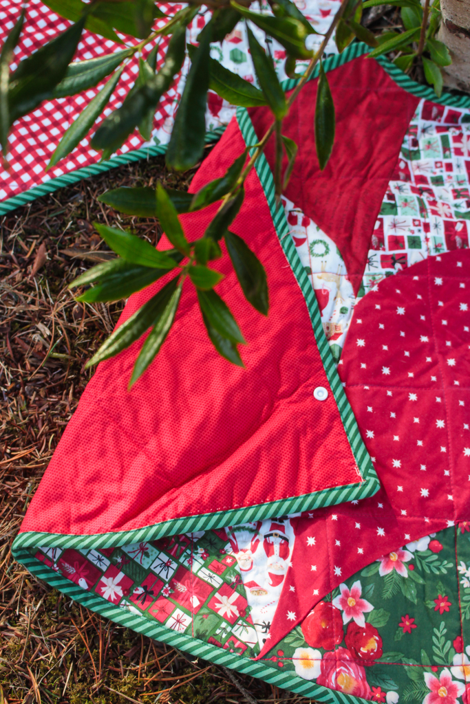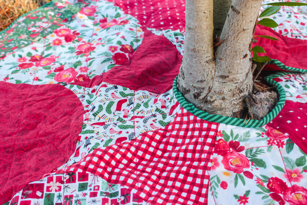 Here is the finished tree skirt! It’s a little early for our Christmas tree to be out, so I used some trees outdoors for staging.