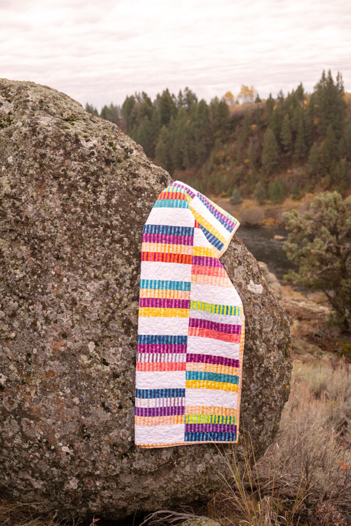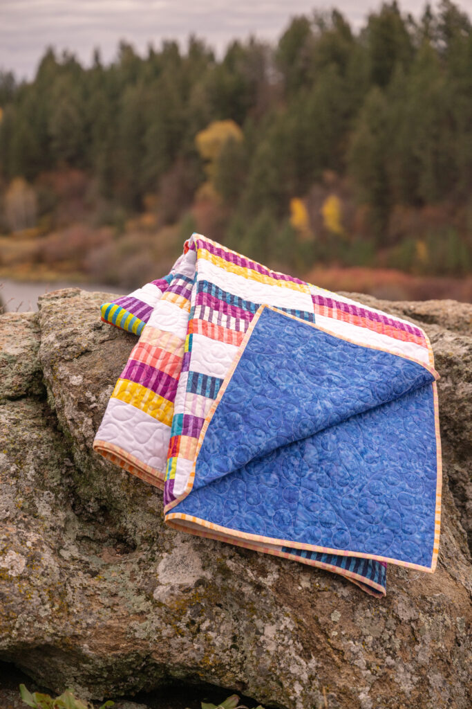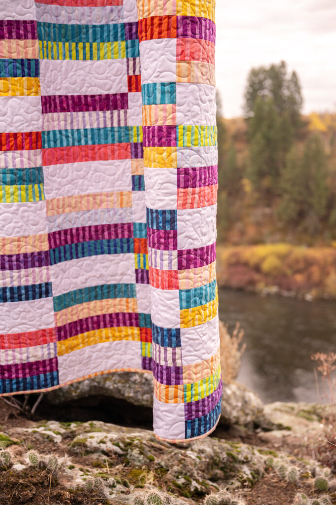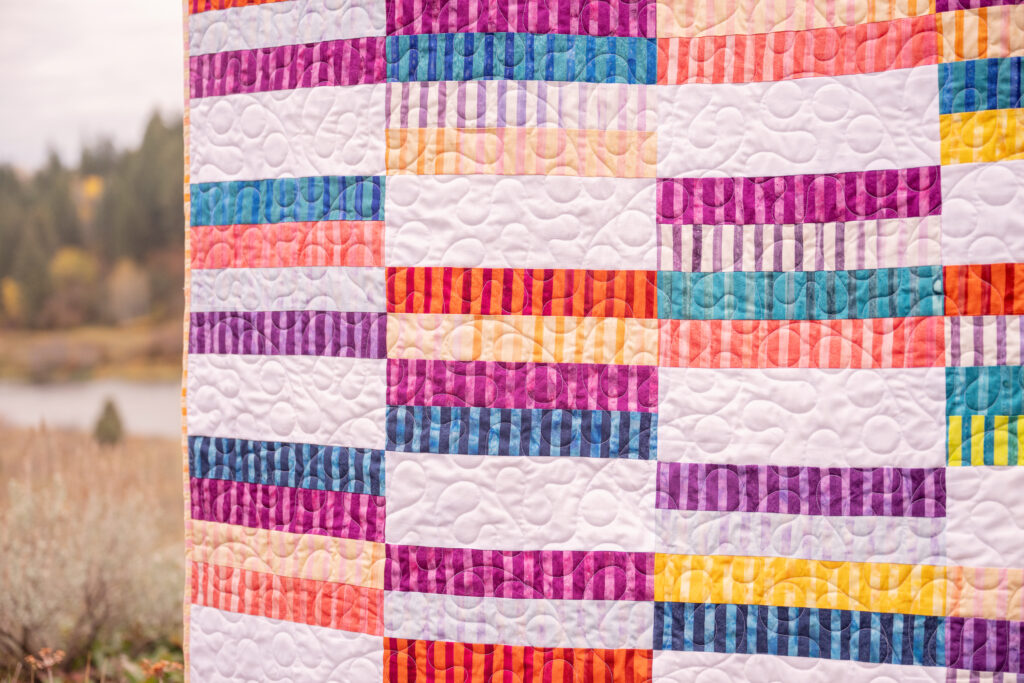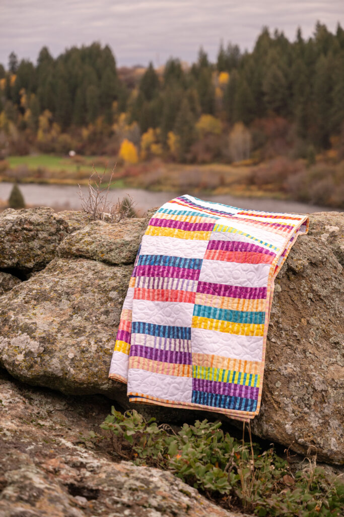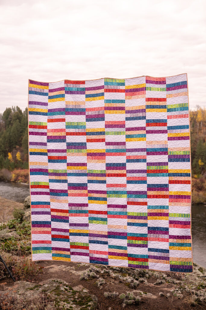There’s something about batiks under a soft fall sky that just sings. This quilt is all rhythm and color—bright, textured stripes stacked in tidy columns, with airy white bands that let the jewel tones glow. We photographed it along the river, and every little bar caught the light like a row of tiny sunrises.