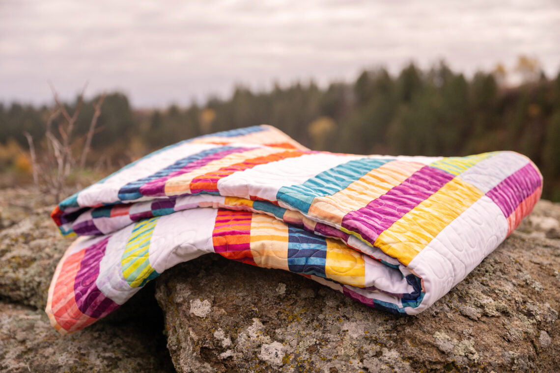 There’s something about batiks under a soft fall sky that just sings. This quilt is all rhythm and color—bright, textured stripes stacked in tidy columns, with airy white bands that let the jewel tones glow. We photographed it along the river, and every little bar caught the light like a row of tiny sunrises.