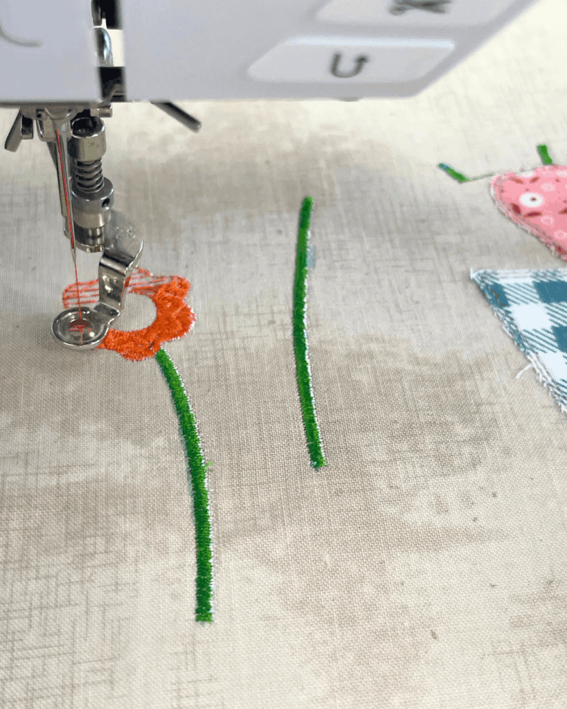 - Use the placement stitches as your guide. Lay each fabric piece so its edge follows the stitched outline exactly before securing.