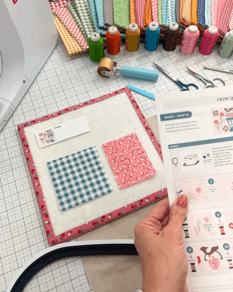 Use Lori Holt’s Trim-It™ Rulers to square the block, aligning the printed crosshairs with your design center. The Basket block trims to 6 ½″ × 6 ½″ for the 6 × 10 stitchable area (see pattern for other sizes).