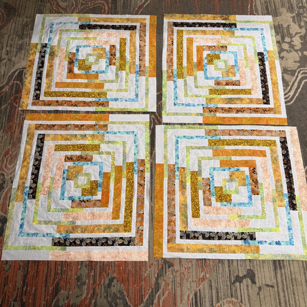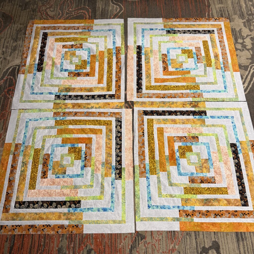 Working from the bags to form each round was smooth sailing, and eventually I had four large blocks. The pattern gives you two different layout options, and after auditioning both, I decided to go with the big circle in the center — it really makes the optical illusion pop.