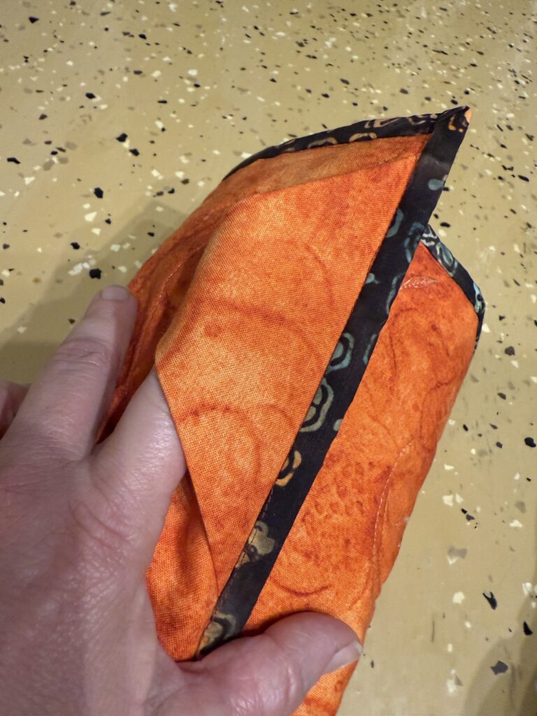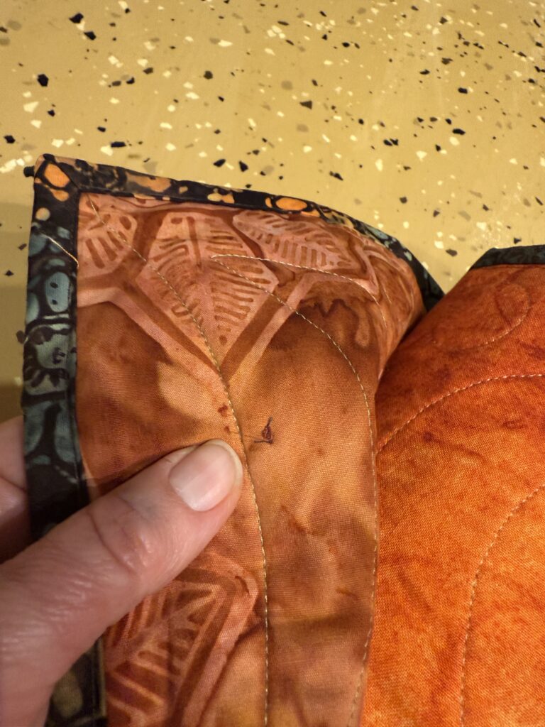 I’ve gotten into the habit of adding hanging tabs while I put on the binding — it makes displaying the quilt so much easier. I cut 6” squares of the backing fabric, press it in half, and then half again. I baste the tabs across the top edge of the quilt, approximately 15” apart, and then put the binding on, fully encasing the raw edge of each hanging loop. Once the binding is finished, I go back with the button tack stitch on my machine to secure the point, leaving enough space for a hanging pipe to slide through.