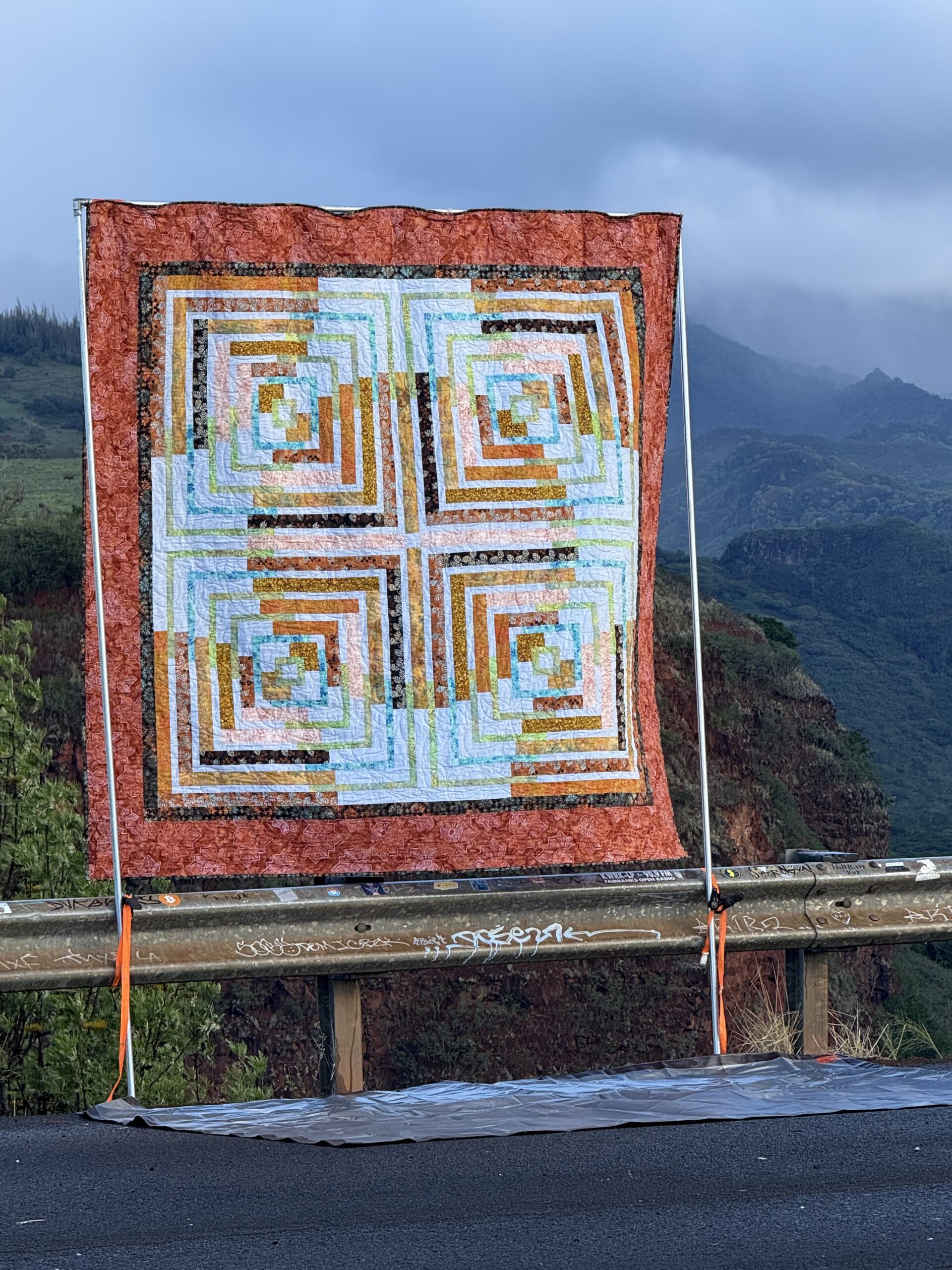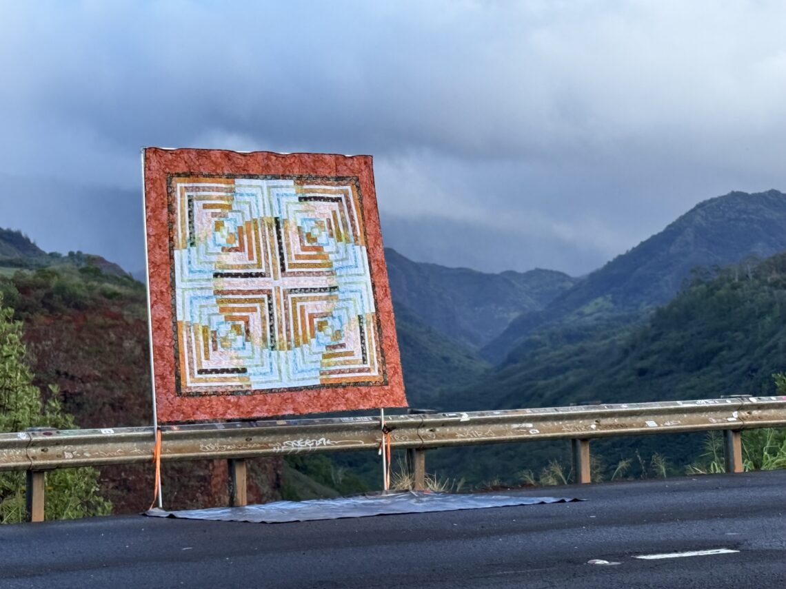 Since the pattern is Antelope Canyon, I thought it only fitting that the photo shoot take place near a canyon, and here on the island of Kauai, the Hanapepe Valley Lookout came to mind. It’s right along the edge of the highway on the west side of the island. To get a good picture, it had to be early in the morning, and there was some special rigging involved — but the photo shoot was successful, and you get to see the beautiful valley in the background.