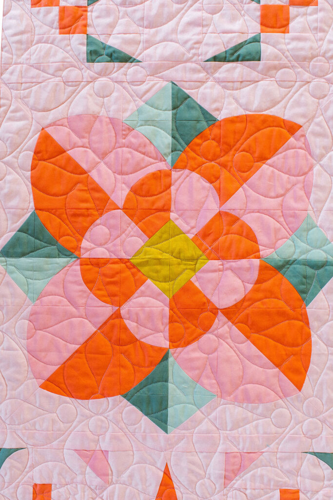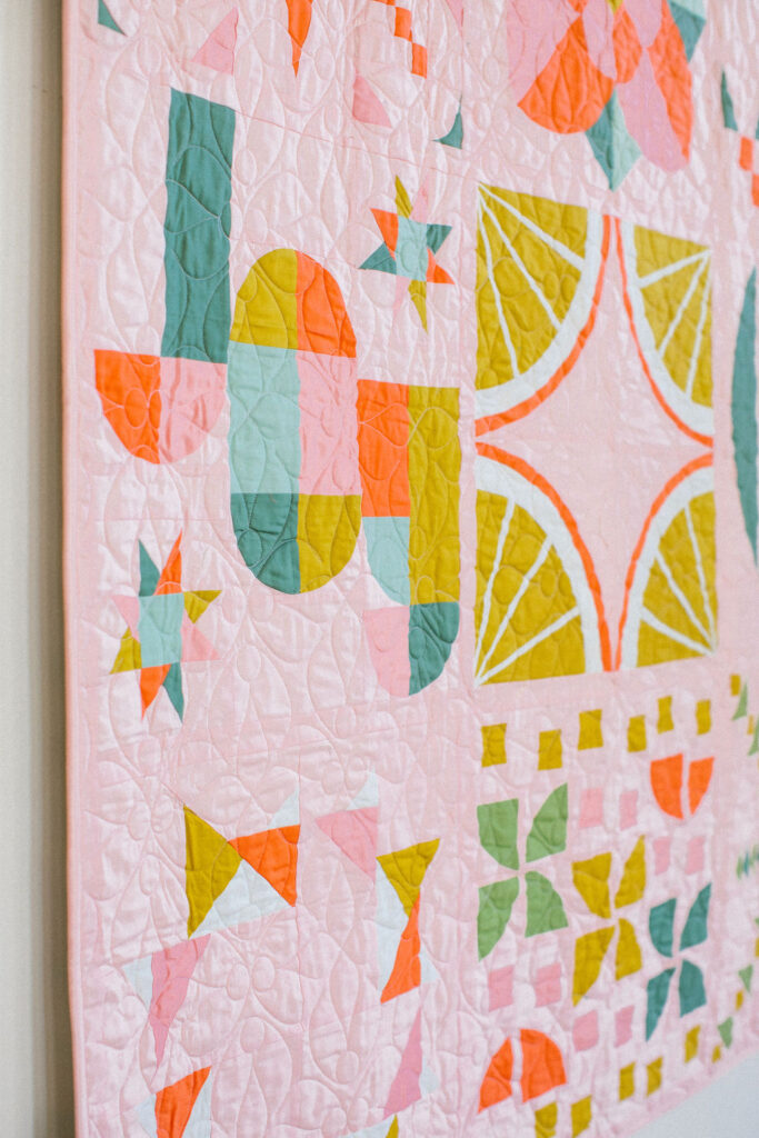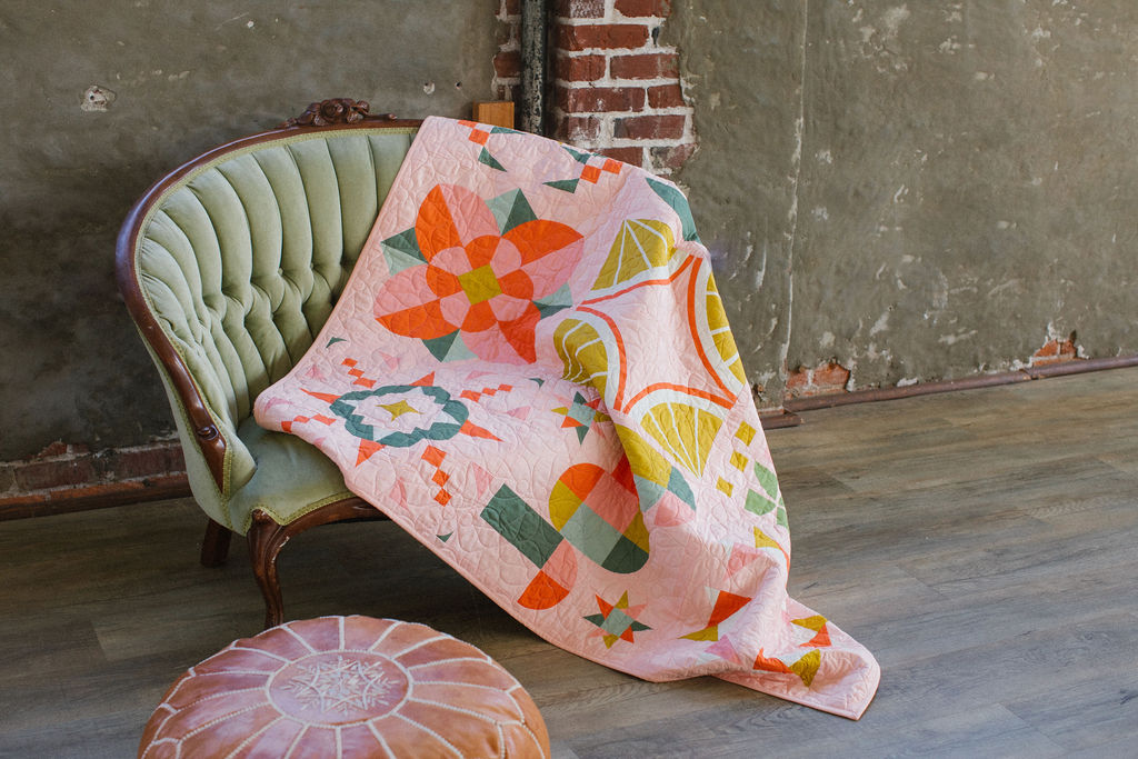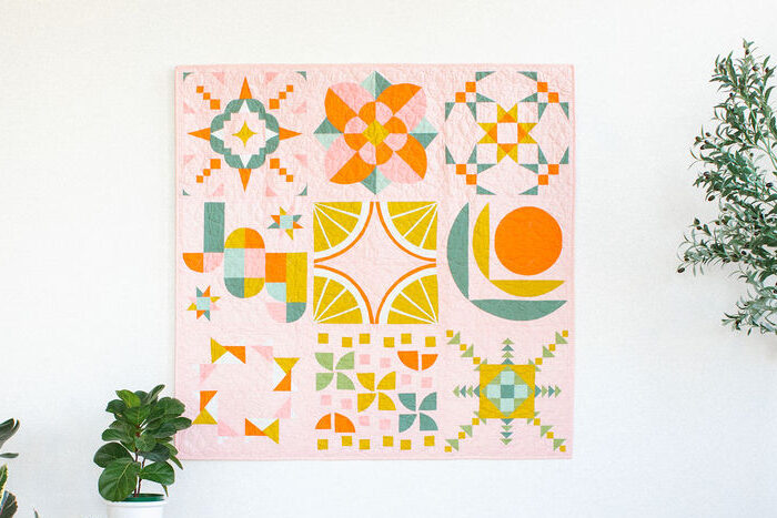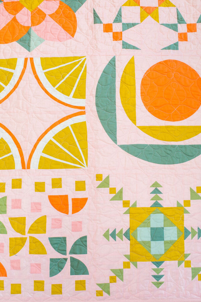 The mix of warm oranges, greens, and neutrals gives the quilt a relaxed, modern look that works perfectly for this sampler.