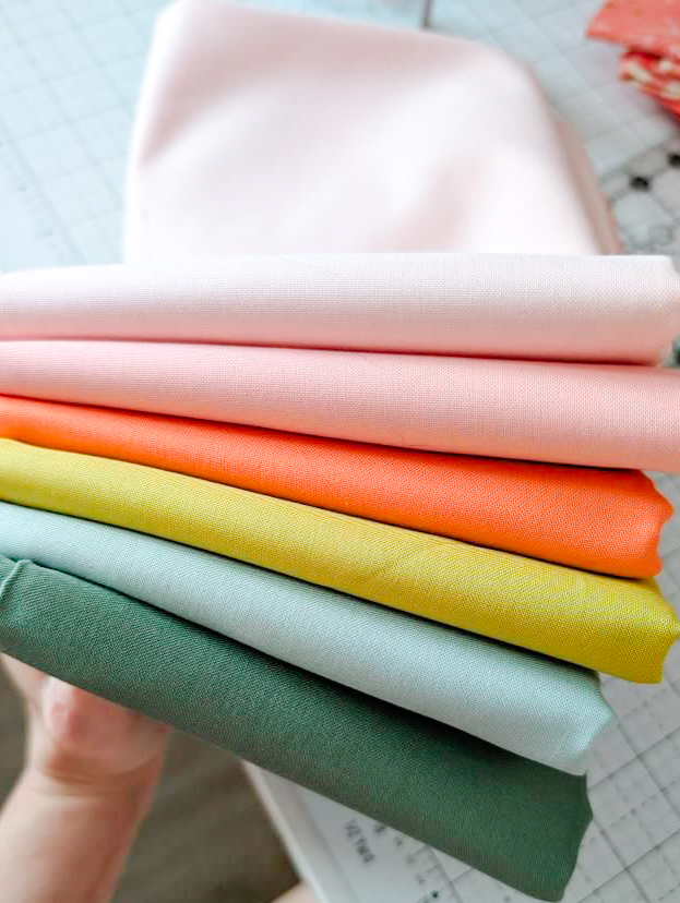 For our Solstice Sampler quilt, we went with a soft, natural color palette that feels fresh and easy to work with. We used Confetti Cotton Solids in colors: Sand Dollar, Papaya, Grapefruit, Curry, Lettuce, Sage, Lodgepole, and Peaches n’ Cream for the background.
