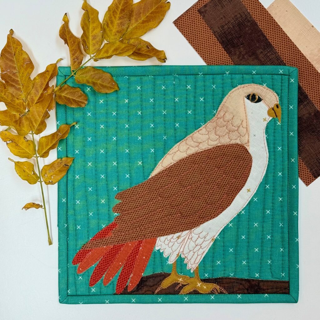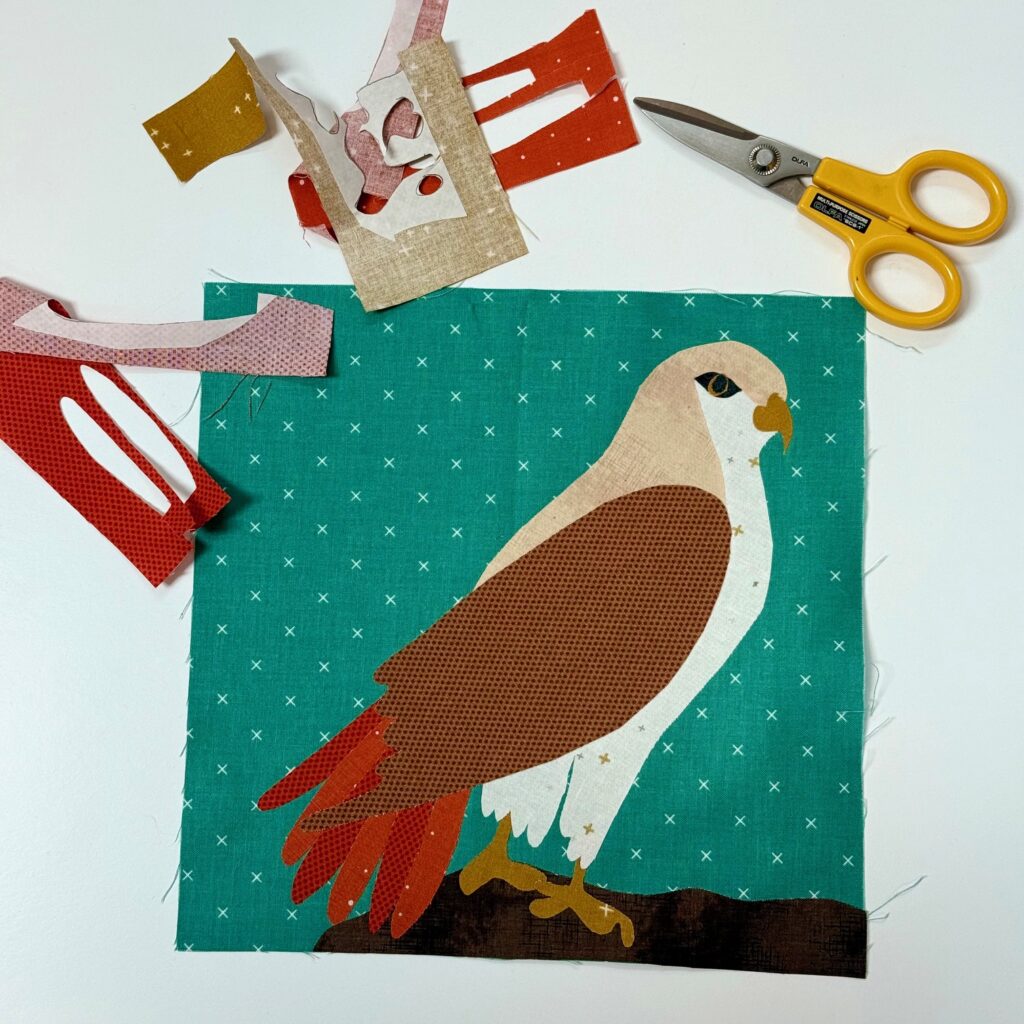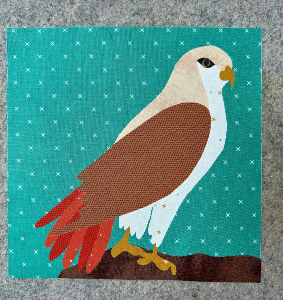 Our seventh block features Zephyr the Red Tailed Hawk. She is inspired by the hawk that has built a nest in a giant cottonwood tree I walk by several times a week. The tree is nestled in the Bosque-the forest that runs along the Rio Grande River-and I imagine is an ideal home because she is near water, wildlife and is protected from predators.