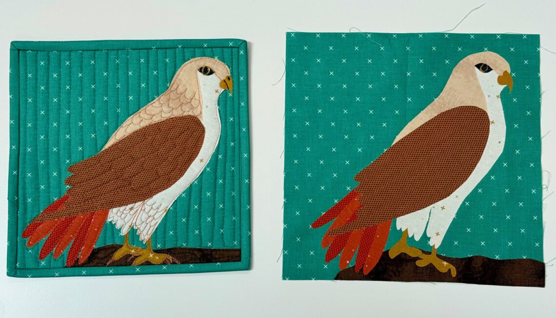 Now that I have my block built, she’s looking pretty cute, but she’s also looking a little flat. This is where free motion quilting can really make a design shine. I’m going to go ahead and use the same free motion technique above to quilt in the shape of feathers along her back, legs and through the wing. I like to use a slightly contrasting thread and in this particular instance I wait until the quilt sandwich has been made so I will be sewing through the quilt front, batting and backing all at once. This quilts the finished project, but it also adds additional texture to the wings.