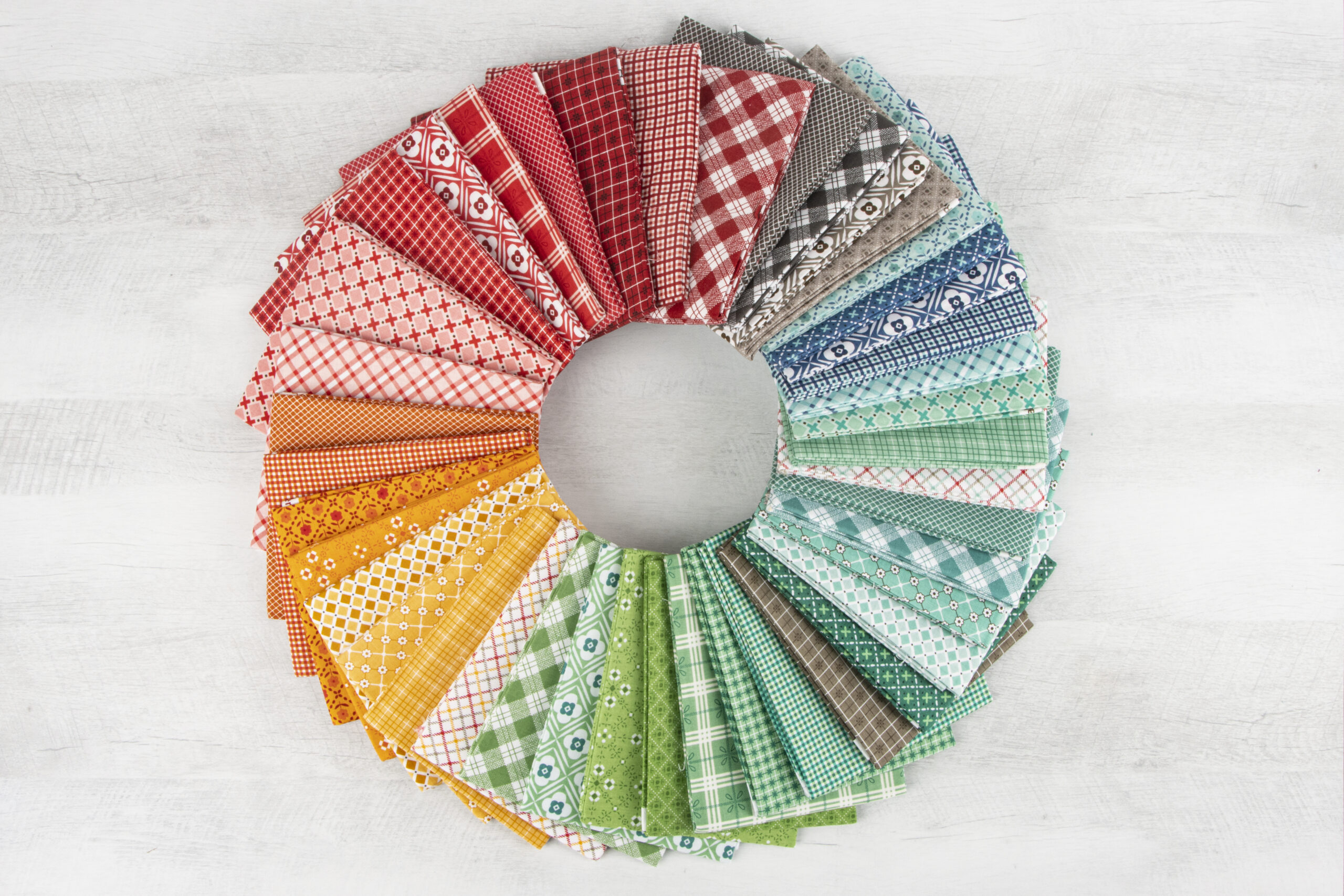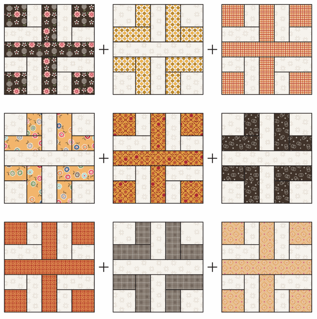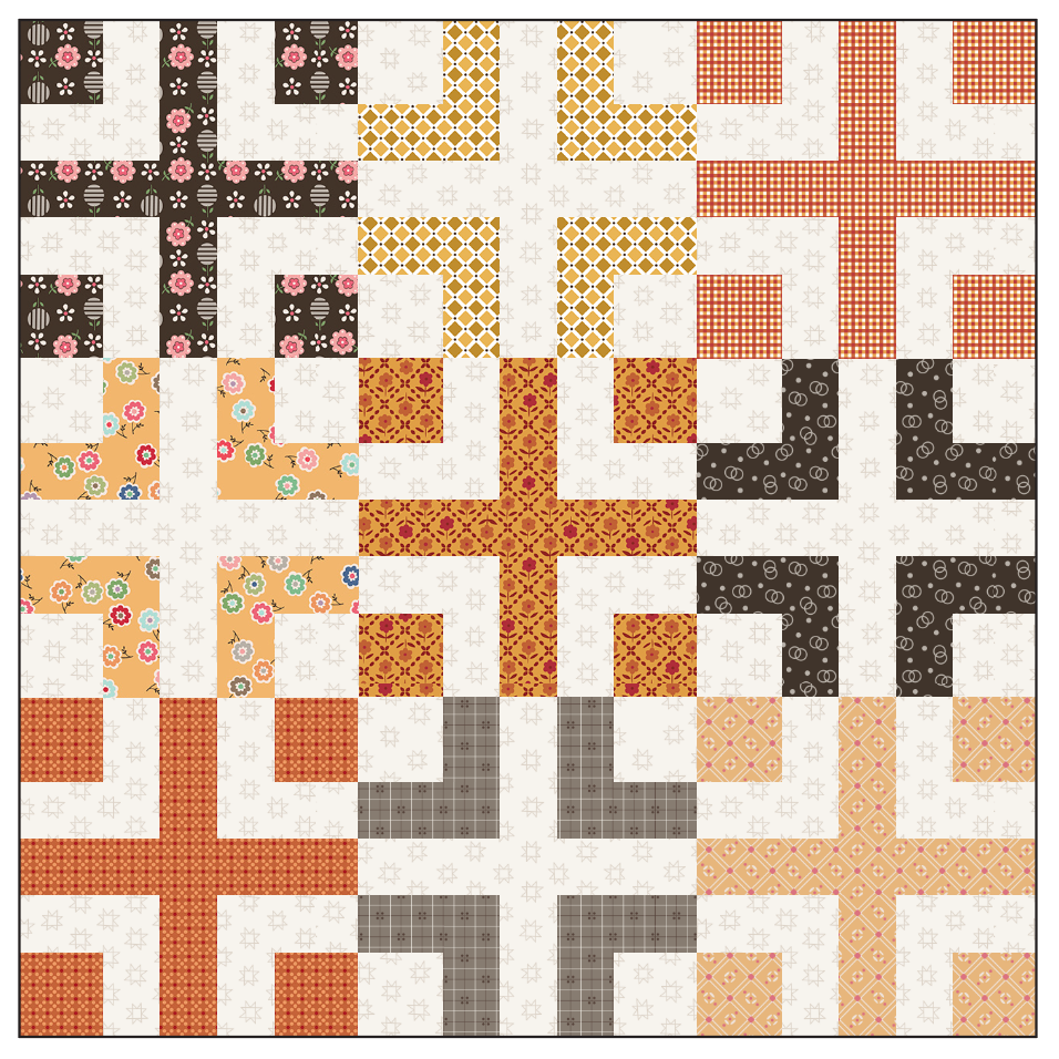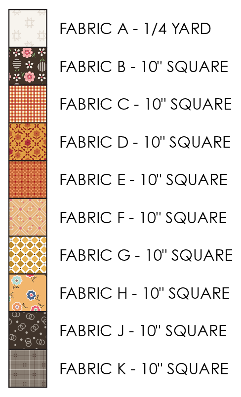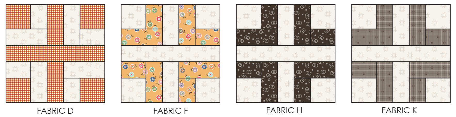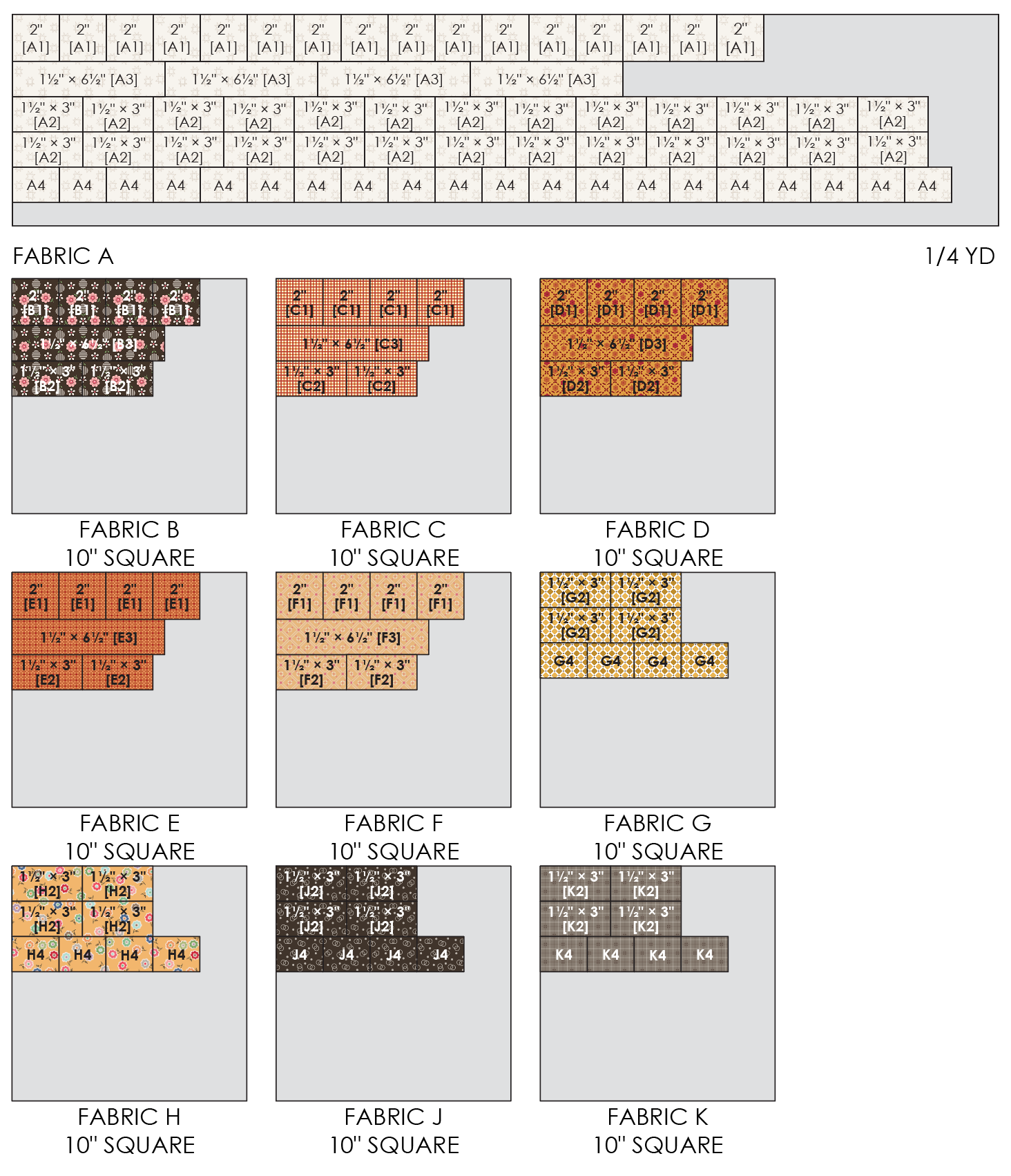 This pattern uses (1) BACKGROUND fabric [FABRIC A] and (9) ACCENT fabrics [FABRICS B-K]. Below are the requirements to make ONE 18″ block.