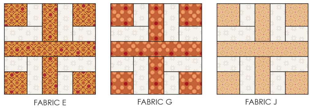 10. Repeat STEPS 6-9 for FABRICS E, G, and J to make a total of (4) BLOCK B units.