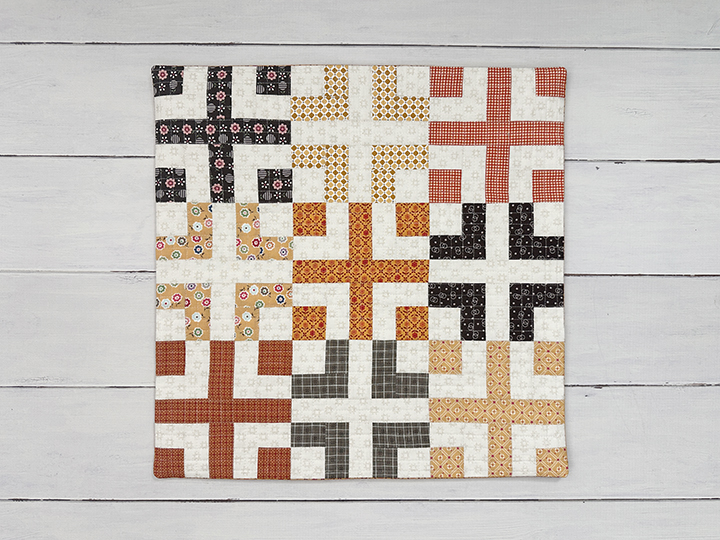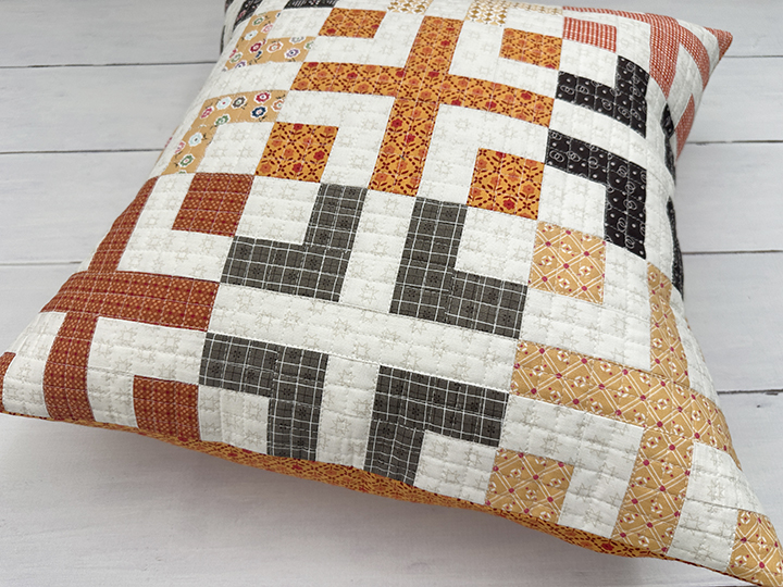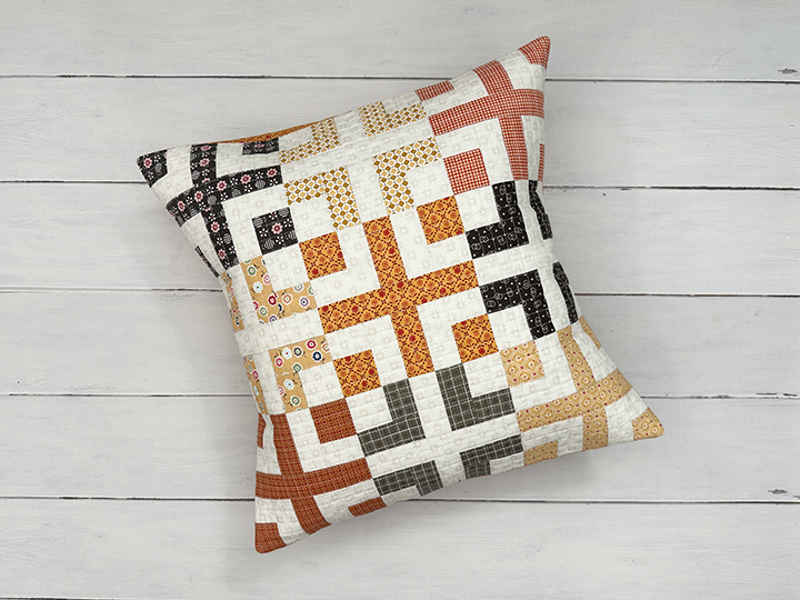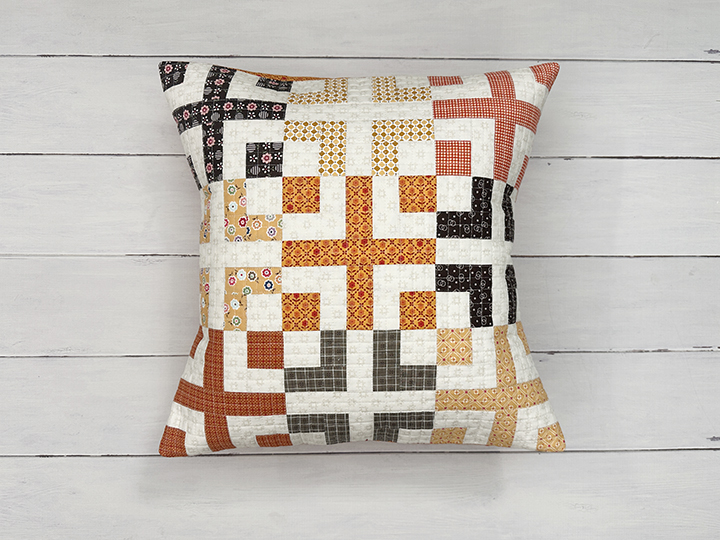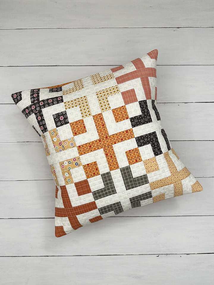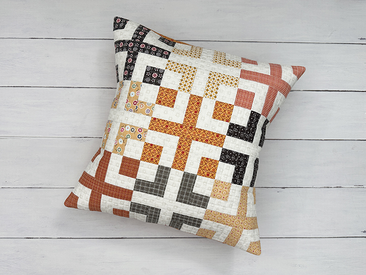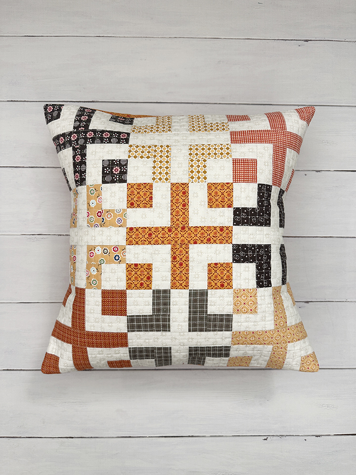 This month’s pillow features mixed prints from Bee Dots and Bee Plaids by the Lori Holt.