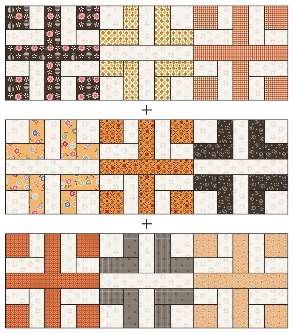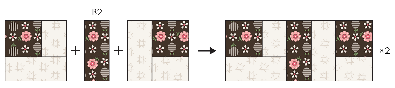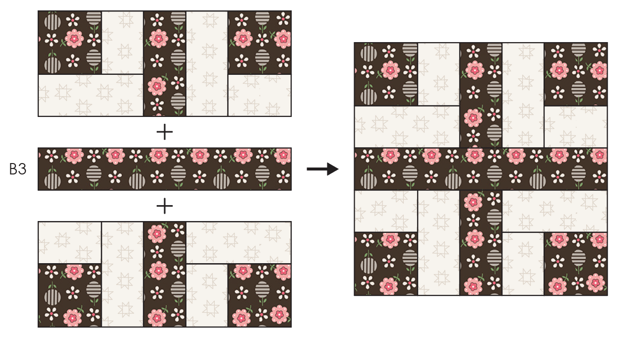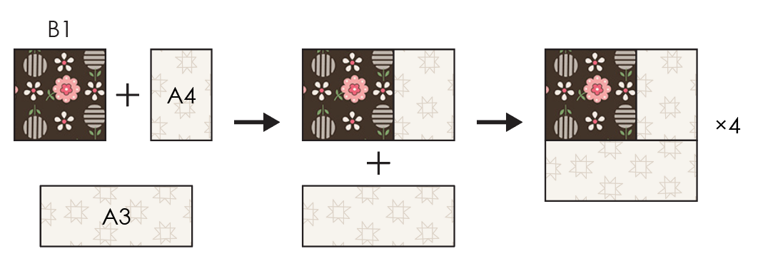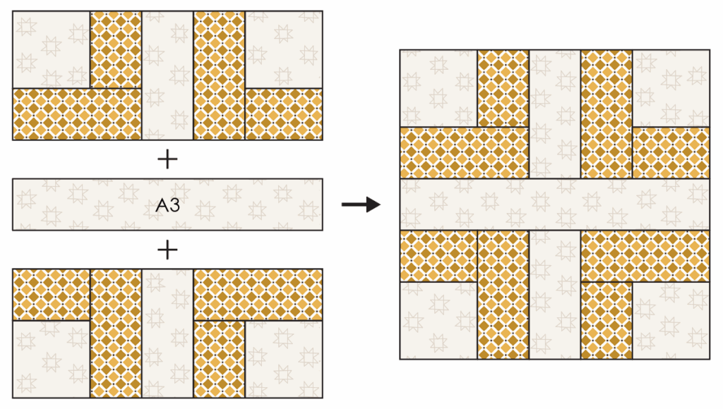 1. Lay out (1) A3, (1) A4, and (1) B1 as shown below. Sew the B1 and A4 together and press the seams.