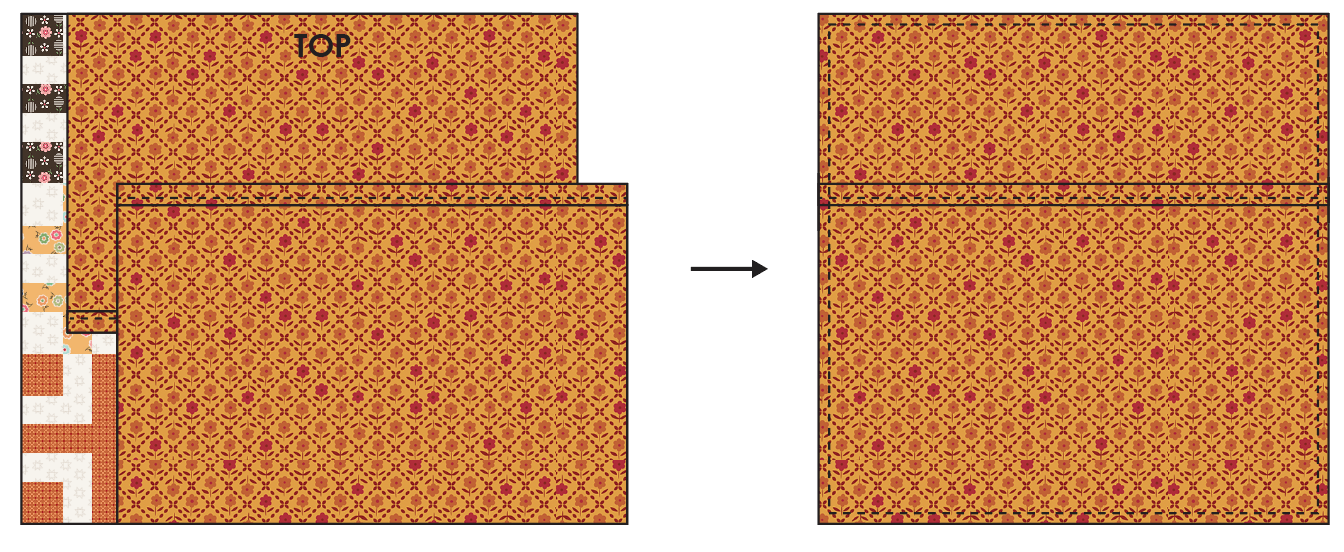 16. With the square top facing up, layer the envelope pieces RST on top of it as shown below and sew a 3/8″ seam around the edge of the pillow top.
