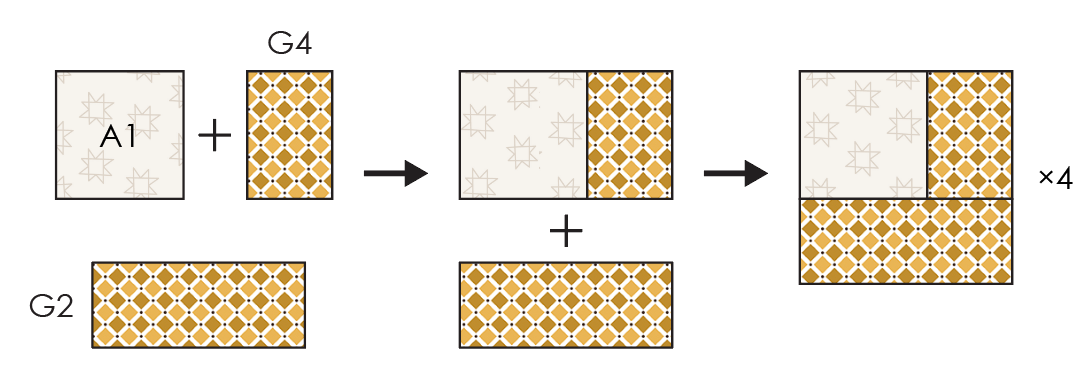 6. Lay out (1) A1, (1) G2, and (1) G4 as shown below. Sew the A1 and G4 together and press the seams.