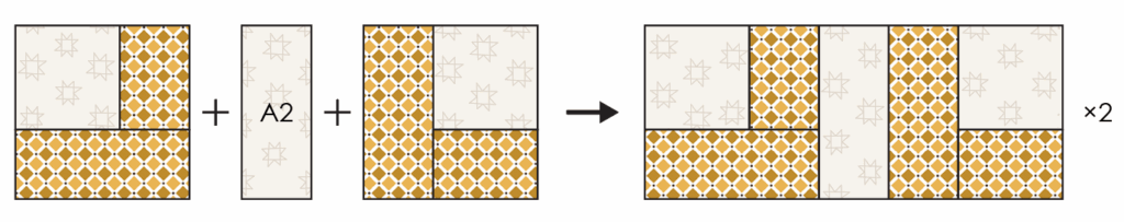 8. Lay out (2) CORNER UNITS and (1) A2 as shown below. Sew all 3 pieces together and press the seams. This is a HALF UNIT. Make a total of 2.
