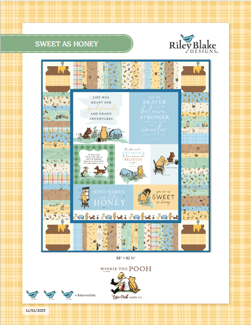 The Sweet as Honey Quilt made with Winnie the Pooh fabrics by Echo Park Paper Co. captures the charm of childhood nostalgia with delightful designs inspired by good friends and grand adventures! Start your own adventure with the classic story of Winnie the Pooh by downloading the pattern below!