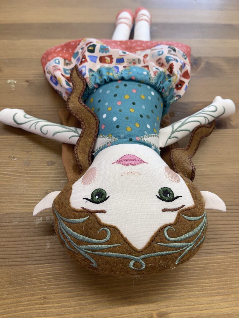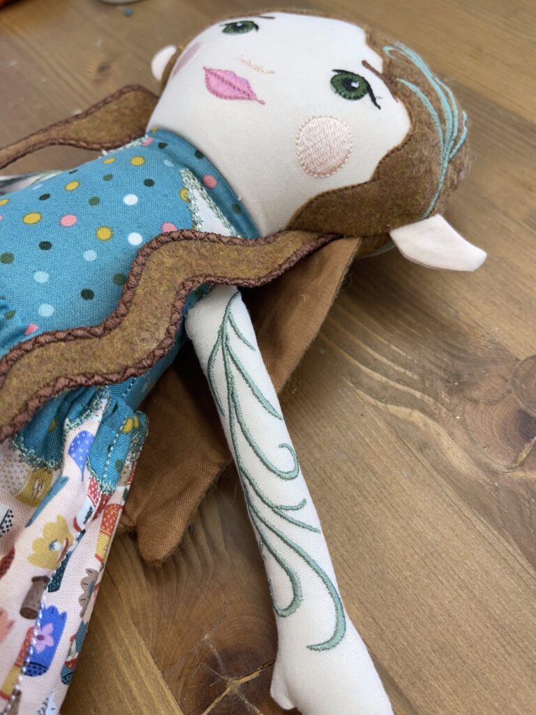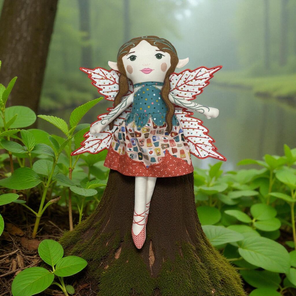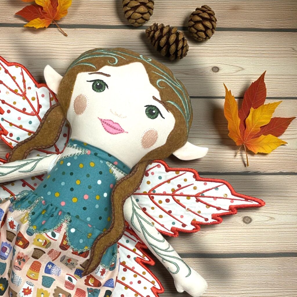 She comes in three sizes (14″, 16″, and 18″) and includes machine embroidery files for her body, bloomers, wings, and even her hair. With basic stabilizers, a little hand stitching, and some fiberfill, you can bring this soft fairy to life.