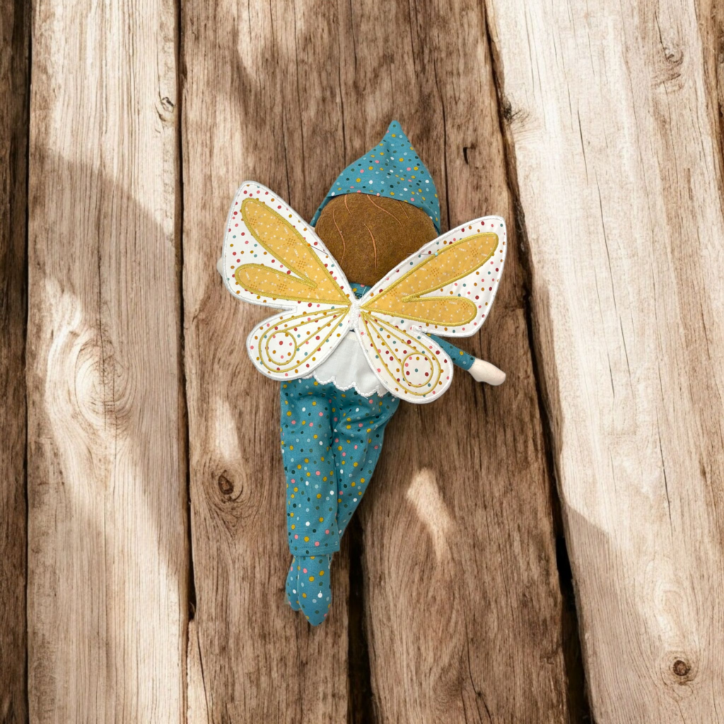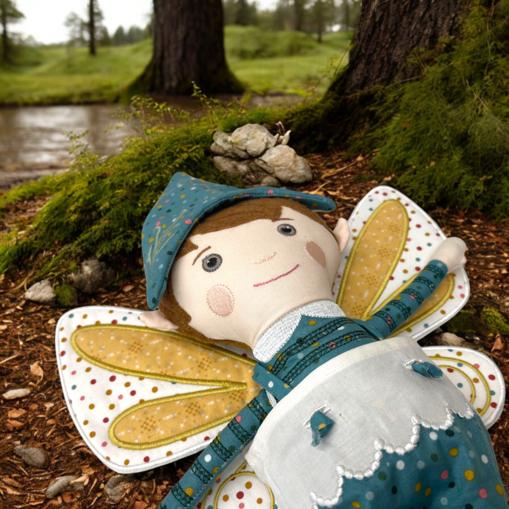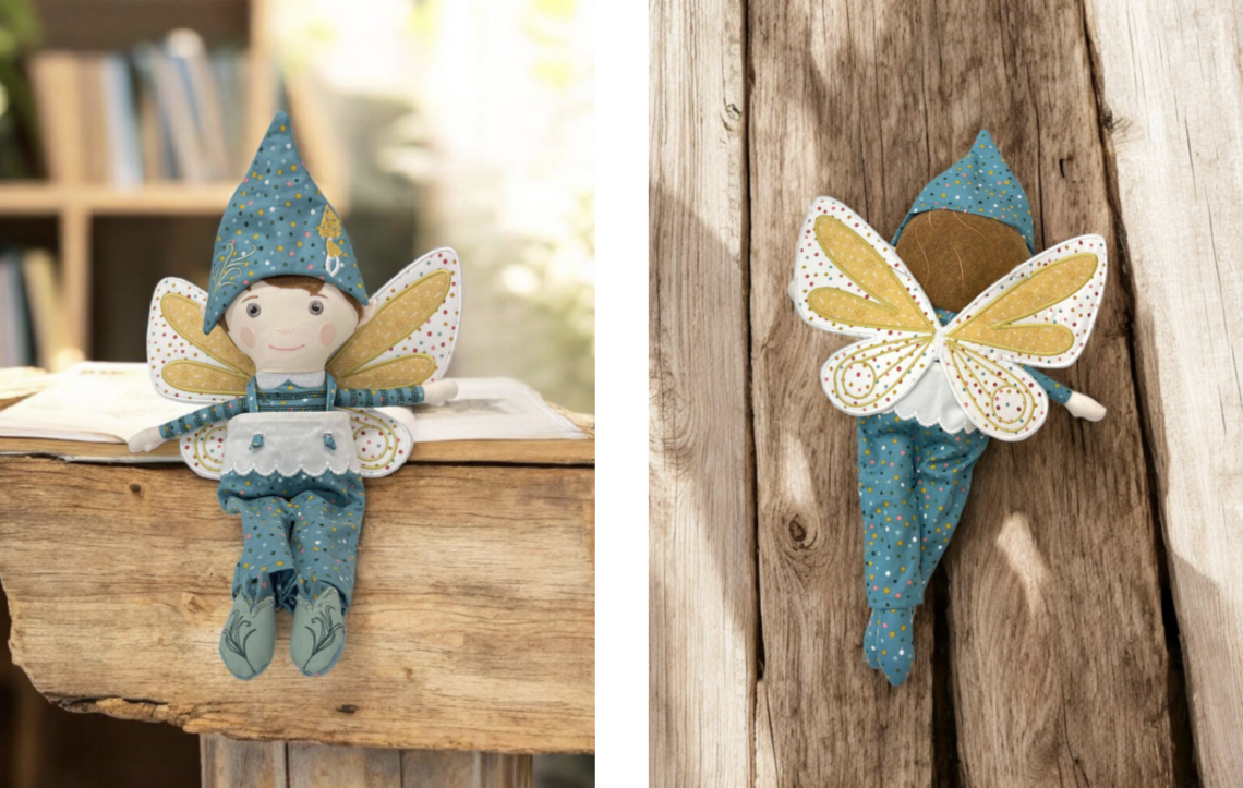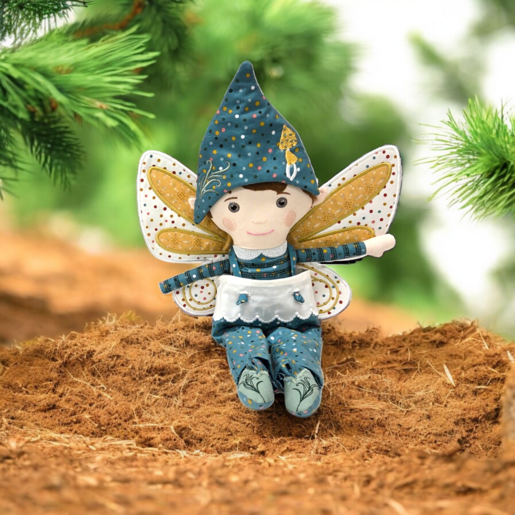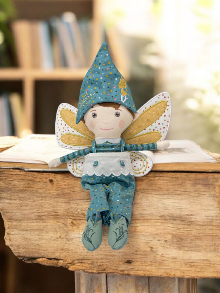 The Dash Doll is designed for machine embroidery and includes files for three sizes: 14″, 16″, and 18″. His outfit includes a soft tunic, stitched on shoes, a pointed hat, and an optional backpack with tiny straps.