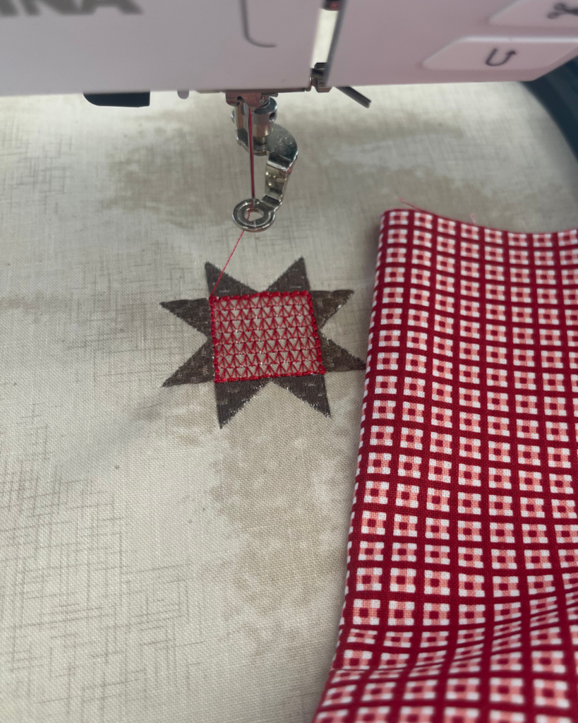 - Choose contrasting thread for decorative lines to achieve a stitched “print” effect within the star points.