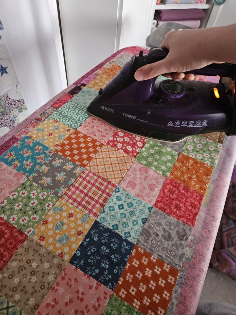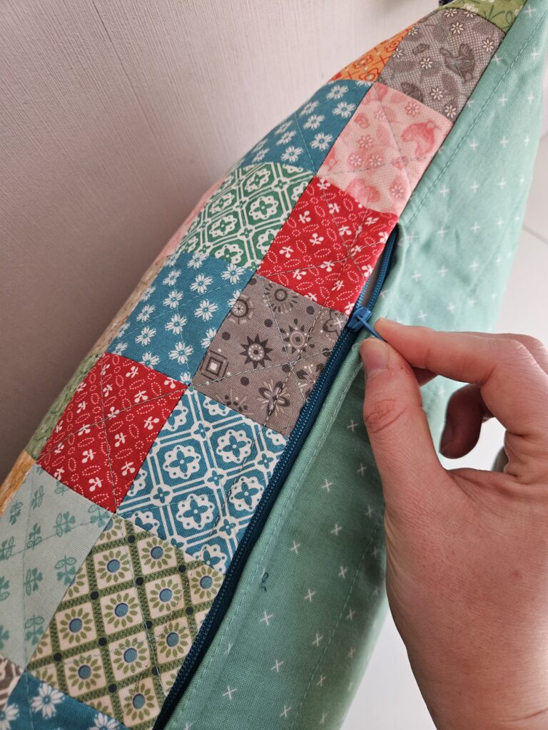 The cushion panel required over 100 squares cut at 2.5″ so for speed I decided to use the grid interfacing method where you arrange your pieces onto a piece of fusible grid interfacing and press to secure them in place. Fold seam row together and stitch with a quarter inch seam. This makes for quick, easy and accurate patchwork. You can find a video tutorial on this method here.