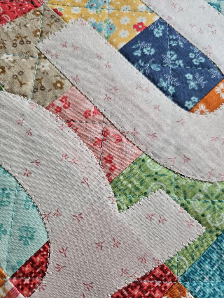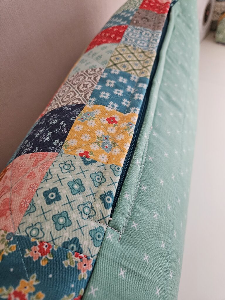 I quilted the panel prior to adding the applique with a teal colour thread. For the back of the cushion, I used lovely fabric from the Bee Cross collection, this is one of my favourite blenders.