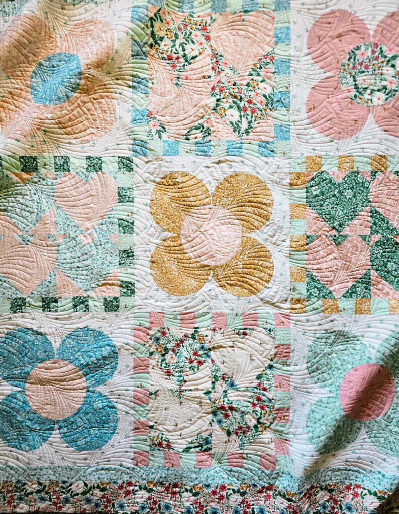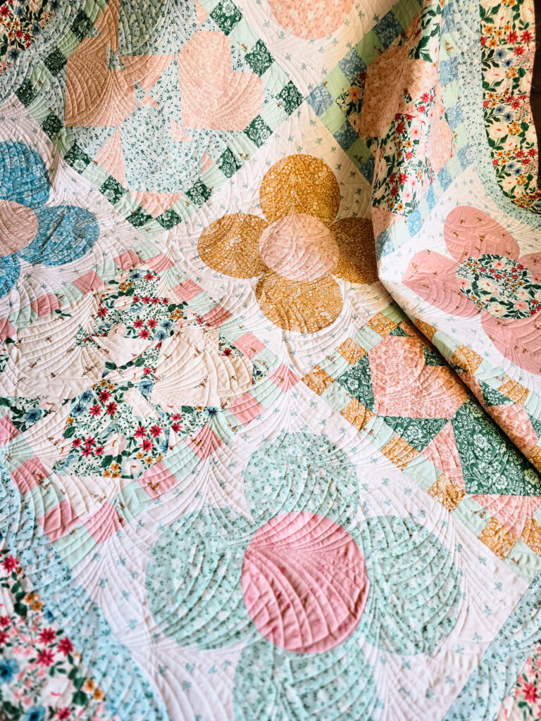 The Mabel Quilt is a cozy 72″ square throw, perfect for snuggling on the couch or adding a soft layer at the end of a bed. The name Mabel felt right for this quilt with its gentle hearts and blooming curves, a design that feels soft and lovable.