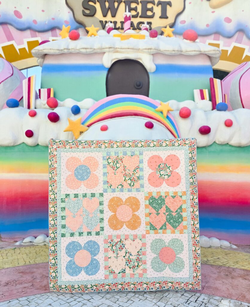Hello, Friends! It’s Sandy from Thai Charm here. Today I am so excited to share a quilt that feels like it stepped right out of a storybook. Using the whimsical Sweet Cotton Tales collection from Riley Blake Designs, I combined two favorite block patterns from my shop, the Mabel heart block and the Windflower bloom block, to create what I’m calling the Mabel Quilt. The soft prints, gentle curves, and heart shapes all come together to tell the sweetest little tale across the quilt top.