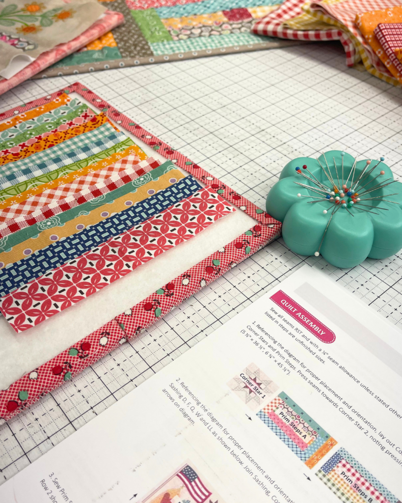 Once your quilt top is assembled and pressed, it’s ready to be quilted and bound. Finish with a binding fabric that complements your Prim palette, and take a moment to appreciate just how much you’ve created, from the very first Flag block to the final Corner Stars and Prim Steps.