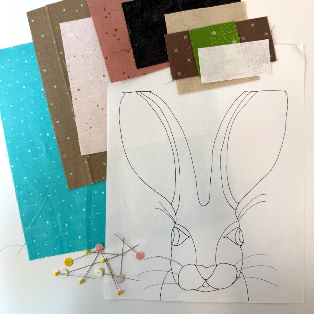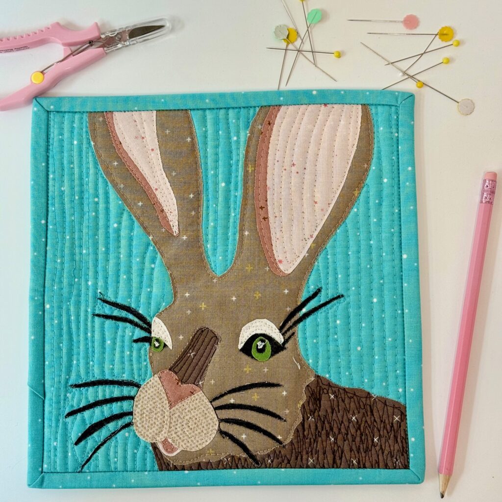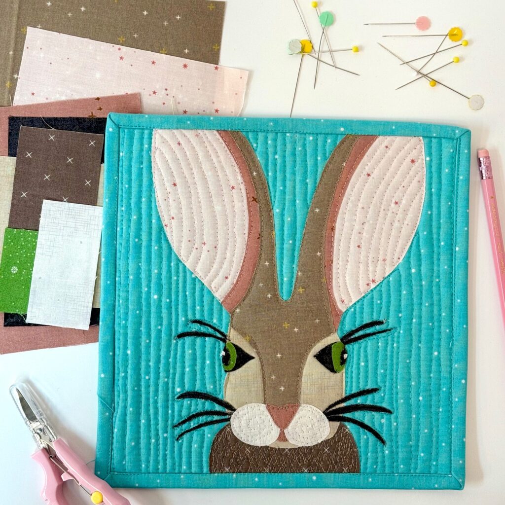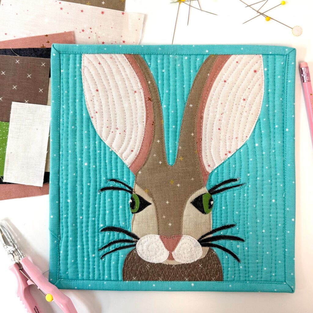 Our eighth block features Jacquie the jack rabbit. She is inspired by the bunnies I see on my daily walks, and by my friend/ customer who rehabs bunnies and sends me fun pictures.
