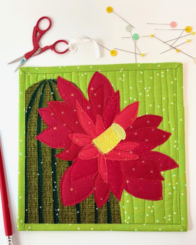 Hi there, all you cool Pins and Needles! It’s Melisa from Stitchology. I’m back today to share with you our 8th block in the 2025/2026 Design of the Month program. On the 2nd Friday of each month, I release a new nine-inch raw edge applique block kit. This year’s theme, Desert Daydreams, is inspired by my childhood in New Mexico. In addition to the monthly blocks, we will release a quilt that incorporates all 12 blocks as we approach the finish line. The blocks are available as kits or PDF downloadable patterns and once the month is over that kit will no longer be available, so you will need to be sure to check back monthly to see the new design and to grab your kit while you can!
