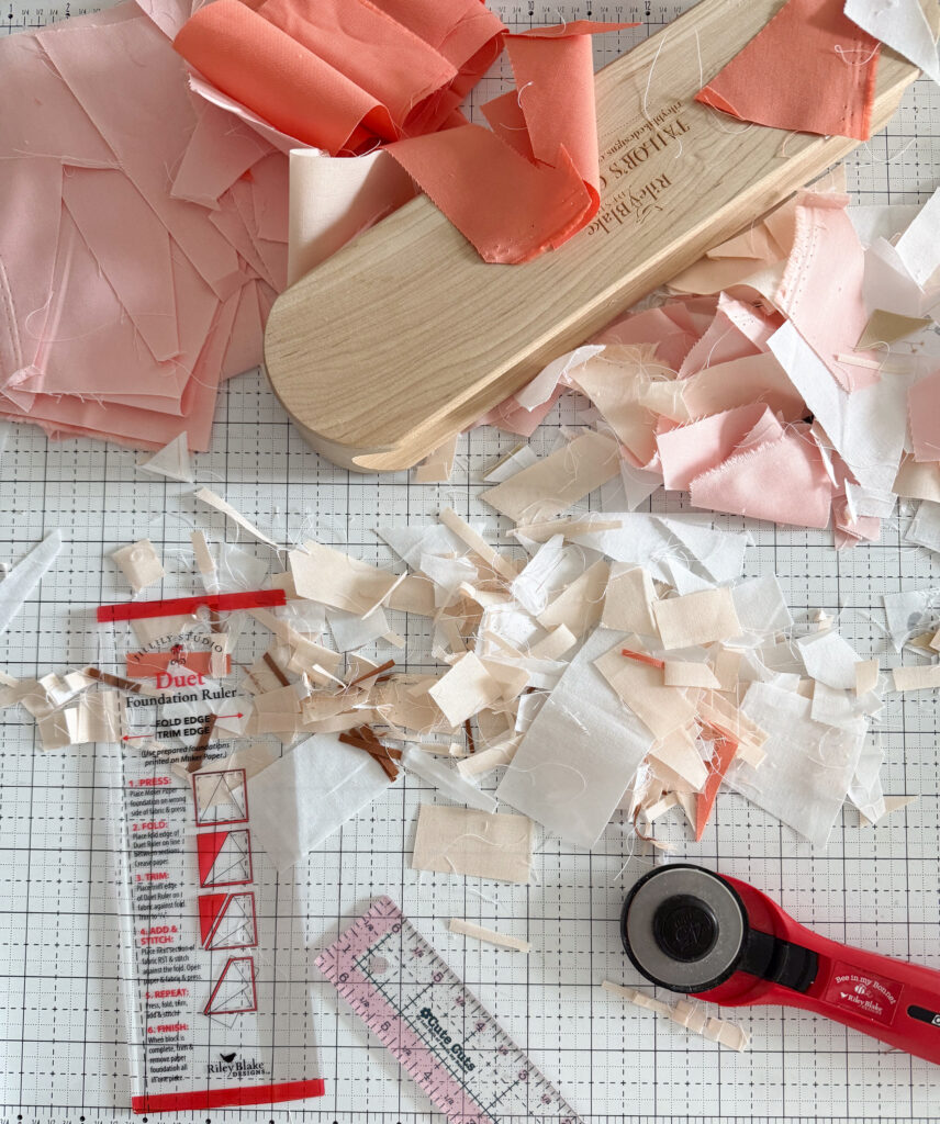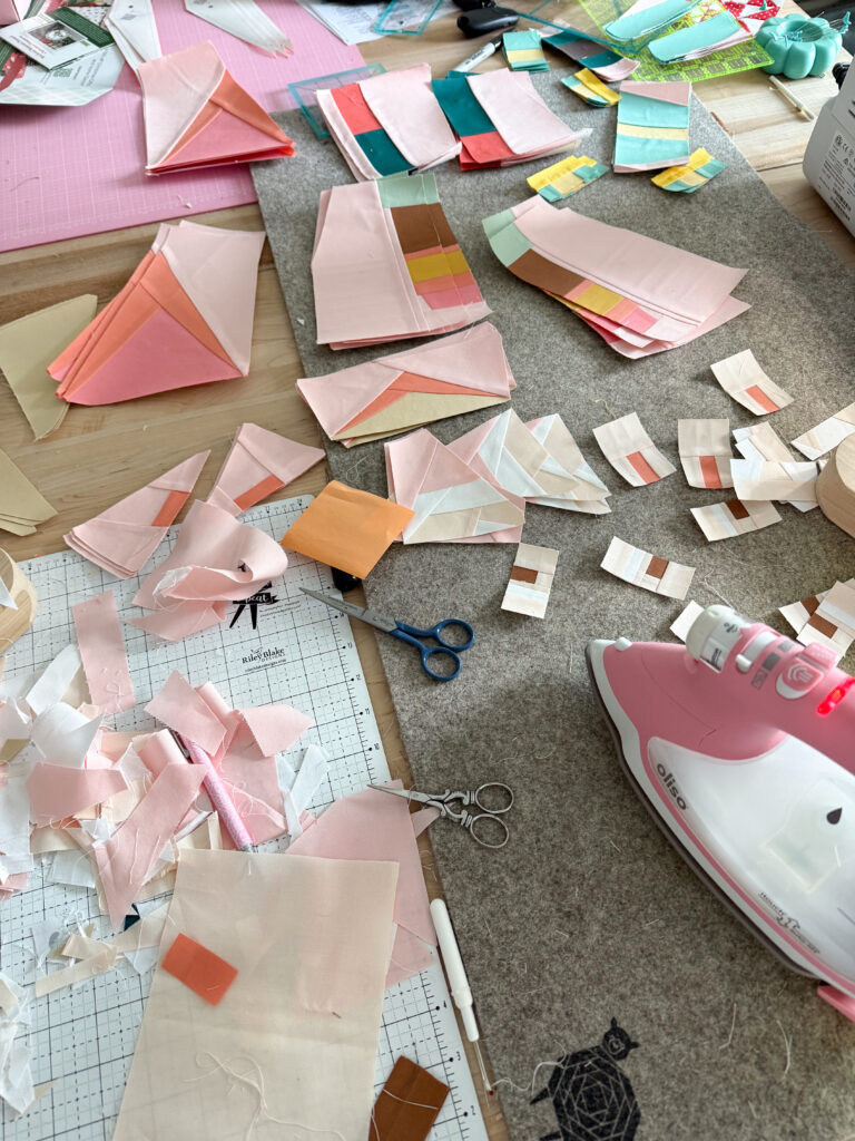 The process of FPP uses lots of small pieces and makes lots of piles of teeny tiny scraps. I loved the method of FPP and the happy mess it made all over my studio table. And floor. And my desk. And the kitchen table… haha. But truly, it was a happy mess. And I saved all the scrap piles in a bin. I’m not sure why? Maybe I will get a commemorative glass jar to remember the process by.