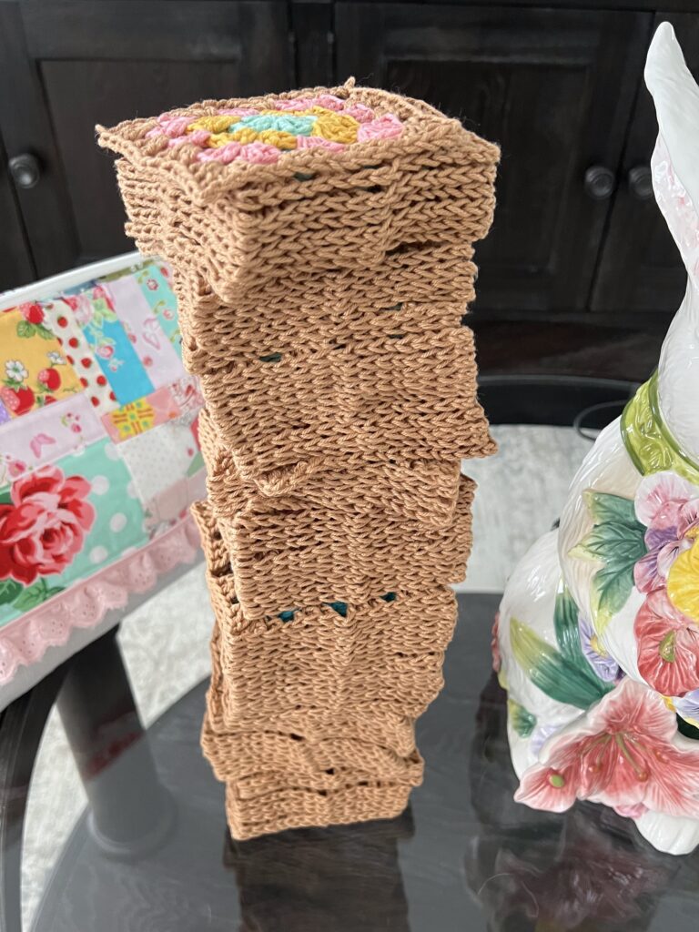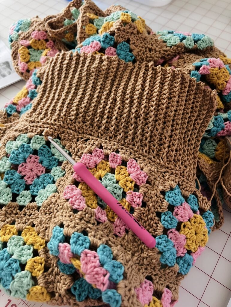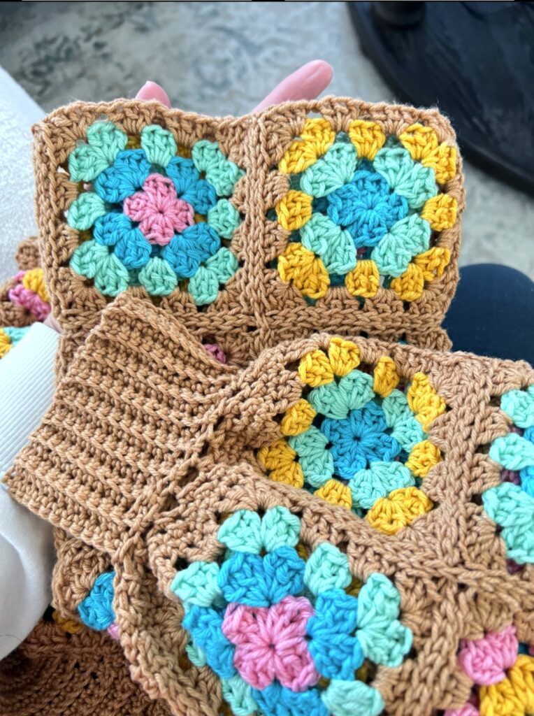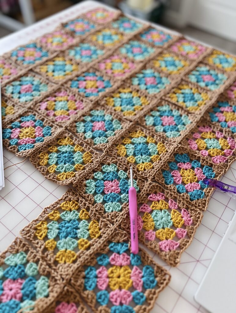 The pattern I chose to use is by MJ’s Off the Hook Designs and it called for 92 granny squares and they looked very cute on my Lori Holt Blocking Board. I loved the fun coral color it came in and found the grid on it to be very helpful with making sure my squares were blocked to the exact size they needed to be.