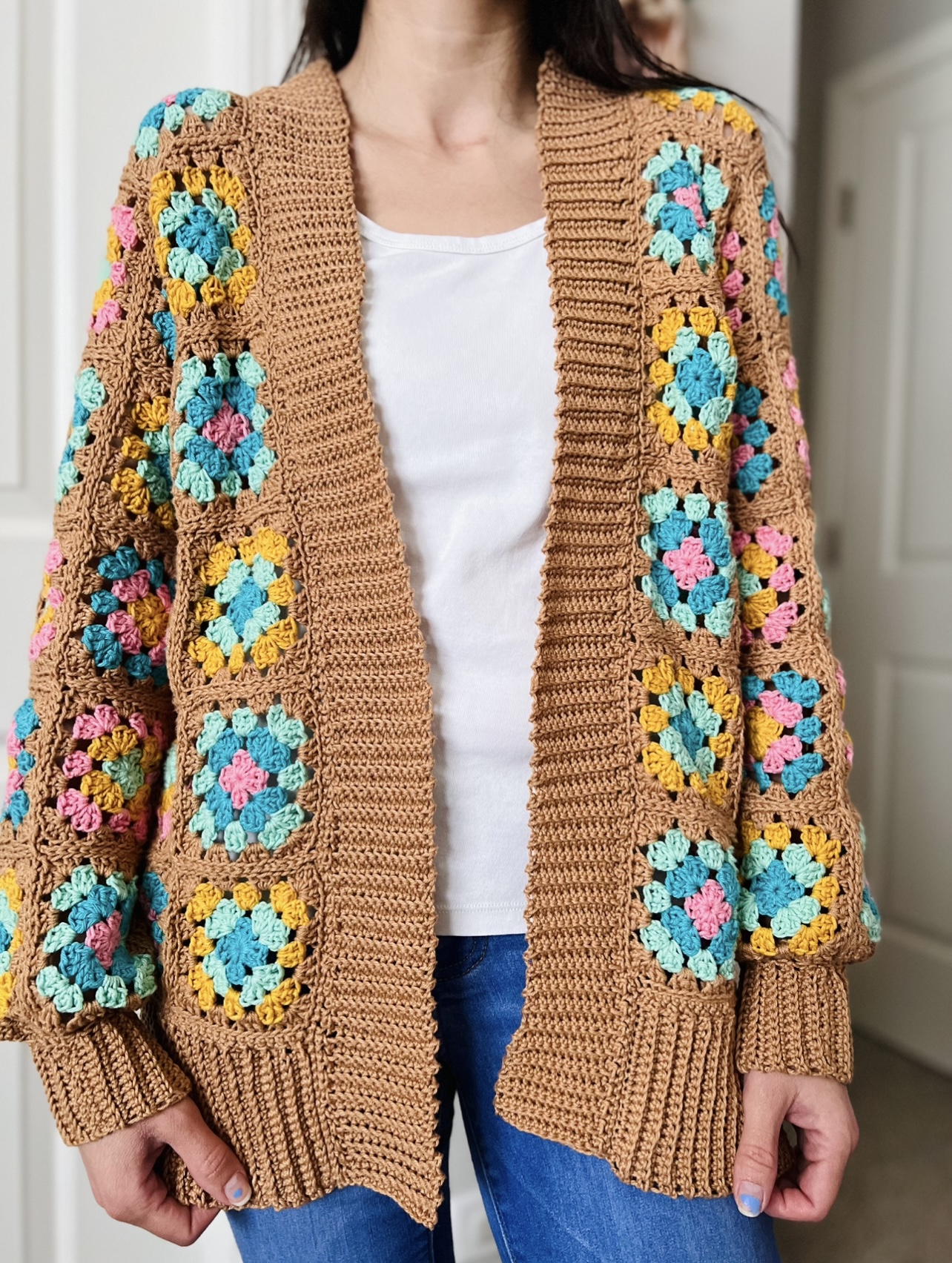 Hello everyone! I am Eugenia and am here to share with you my granny square cardigan that I had the absolute pleasure to make with Lori Holt’s 100% cotton Chunky Thread! While it isn’t my first crochet project, it was my first cotton project as well as my first garment item so this made for an exceptionally exciting and fun opportunity!