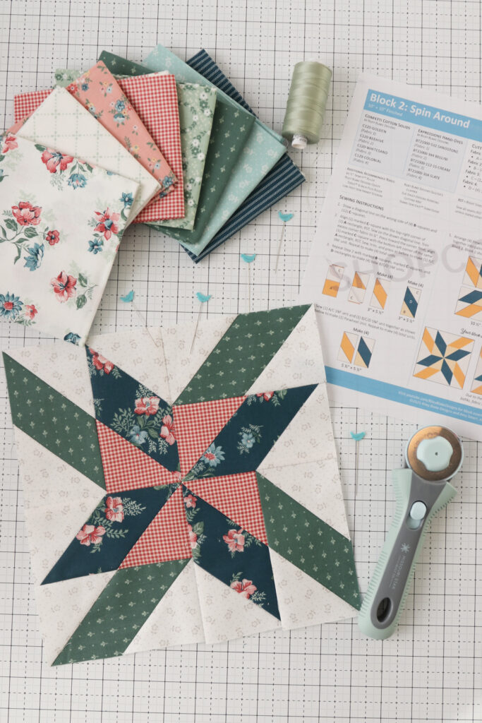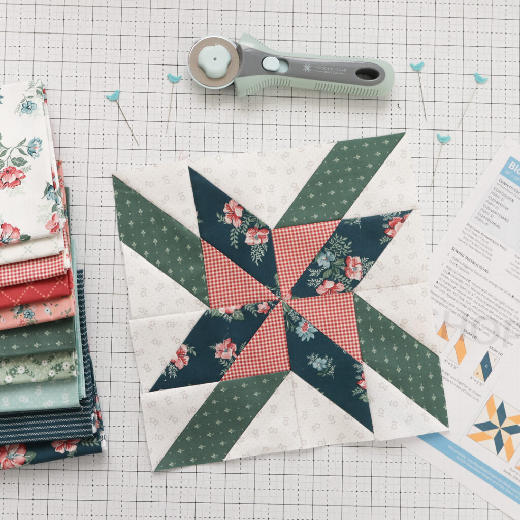 Our second block is called Spin Around and is designed by Amy Smart. We are sewing our blocks in Confetti Cottons and our Batiks. Amy’s blocks are made in her latest collection, Mary Catherine! Isn’t her block stunning?! See more on Amy’s blog!