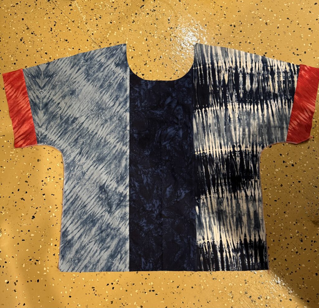 Blue and white, with a flash of red—this color story feels unmistakably Asian. To weave that influence through the garment, I trimmed the sleeves with red shibori, a subtle punctuation mark against the indigo field.